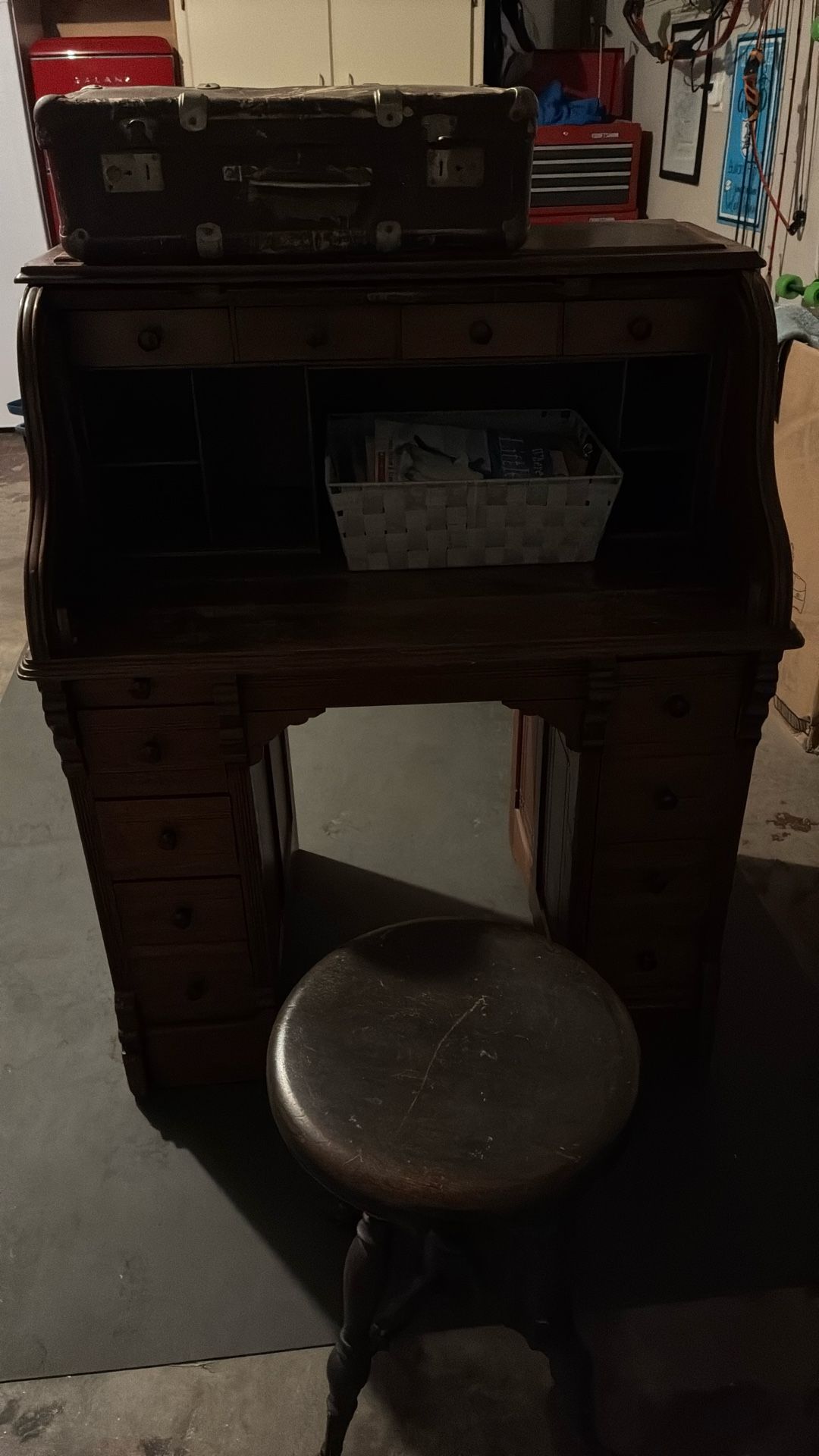 Selling this antique roll top desk. Don’t know a lot about it, it was my Dad’s before he passed. If interested let me know and I will be glad to answer any questions. We are adding in the stool and the suit case.