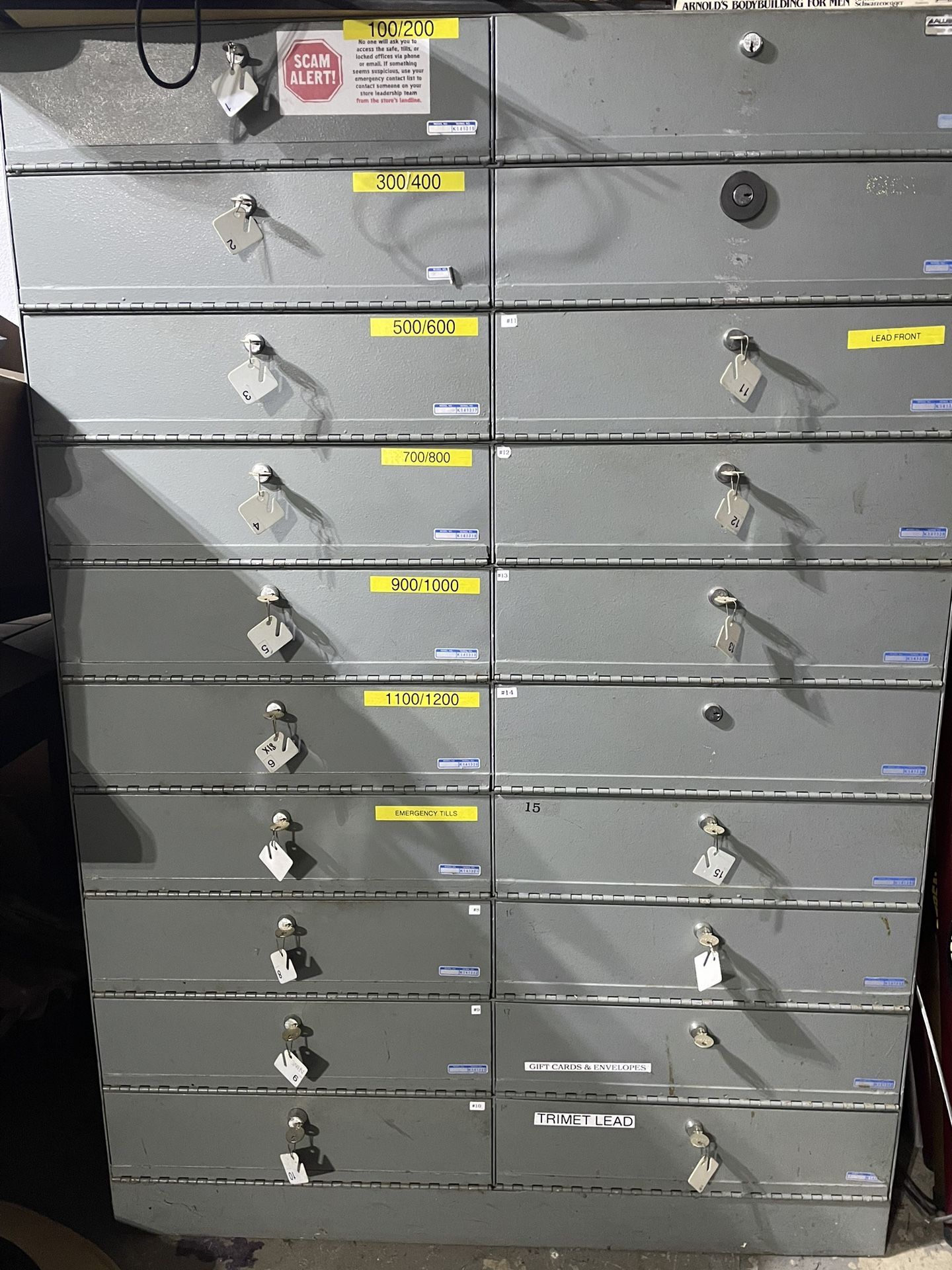 Selling a multiple compartment safe. Designed for cash register tills. Measures 17 inches deep x 40 inches wide x 57 1/2 inches tall. Has 20 separate compartments, each keyed differently. Missing 3 keys. Has the master key which locks/unlocks all compartments. Extremely heavy. You haul. Bring a dolly and help to move it.