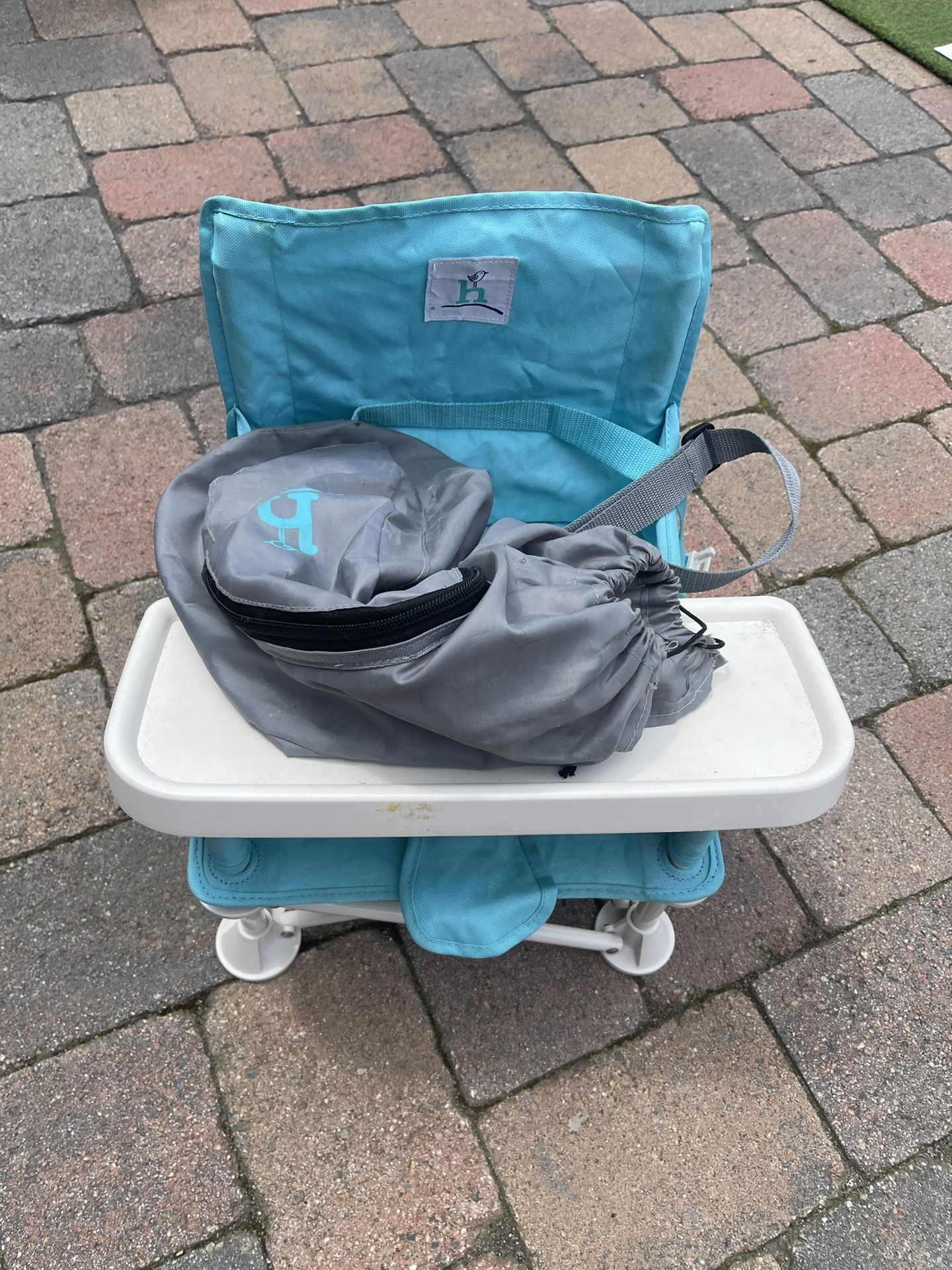 Foldable beach/camping/travel seat for babies or toddlers. Comes with removable table top and carrying bag.