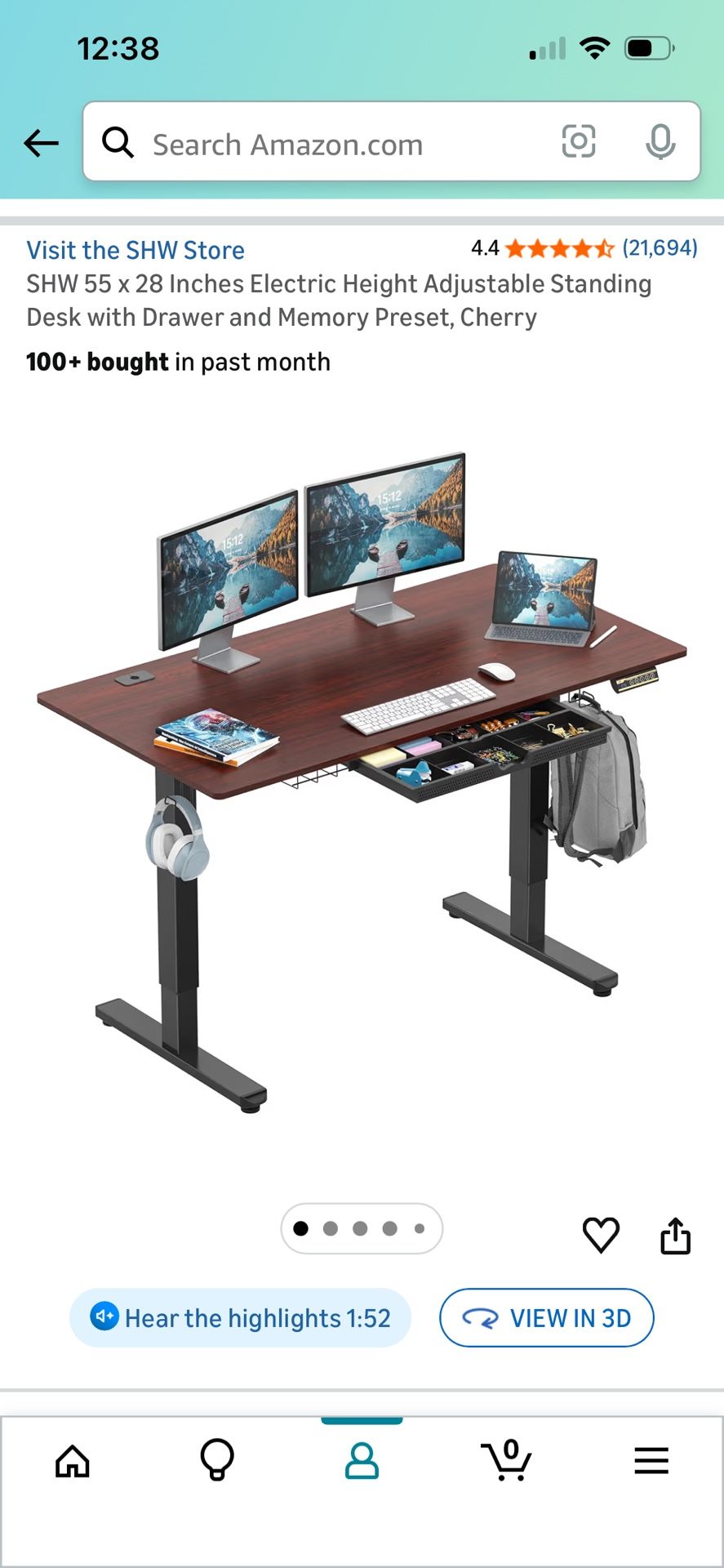 Cherry wood colored adjustable desk. I have loved this but we're having a baby so have to get rid of our office to make room. Originally paid $200 and is selling for $190 on Amazon brand new Its only "problem" is it makes a clicking noise when you move it from low to high but this is probably user error on my part when I put it together. You can probably fix it, I just never bothered because it didn't impact the function