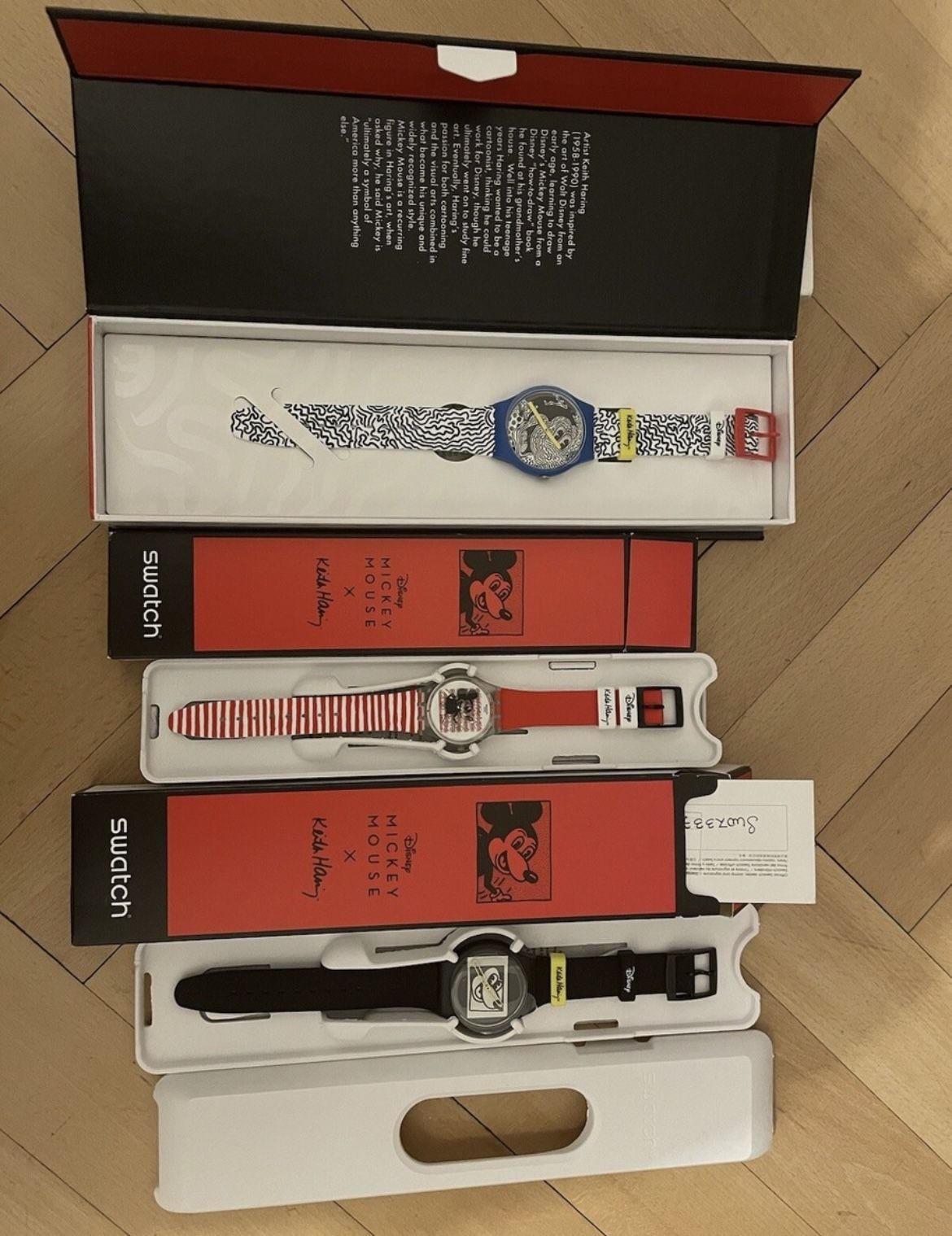 Keith Haring Mickey Mouse watch collection! Two idols collide in a Swatch watch collection. If you know what you are looking Q qat then you know these will go up in value! $350 is an exceptional value!