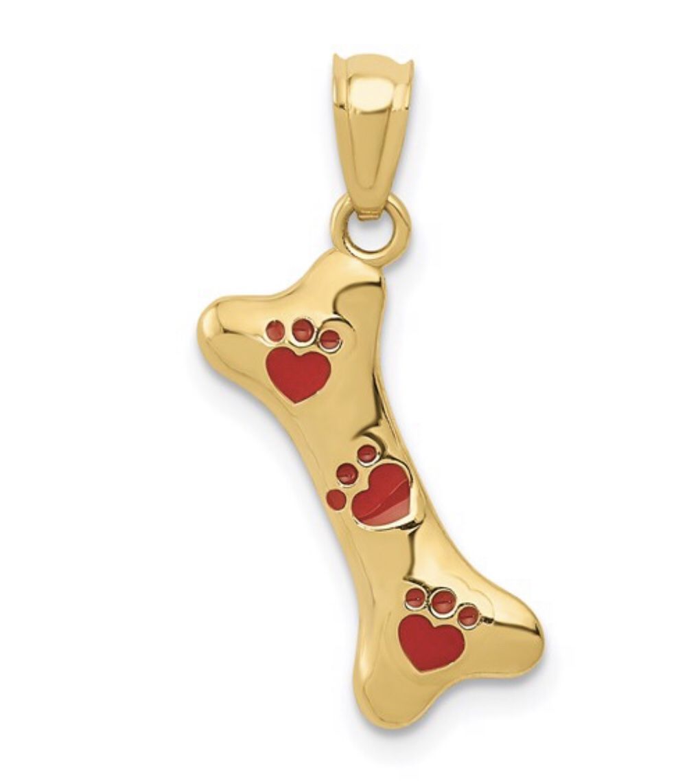 14K Yellow Gold with Red enamel dog bone charm. The bail canhold up to a maximum of a 3mm chain. This is a special order item. There are no refunds on special orders. Exchanges equal or greater to purchase price. Store credit only. Price excludes a 7.25% sales tax. We do not deal with shipping agents, movers, etc. Such transactions will be refised and reported to law enforcement and dealt with to the fullest extent allowed by law. We do not ship out of state.
