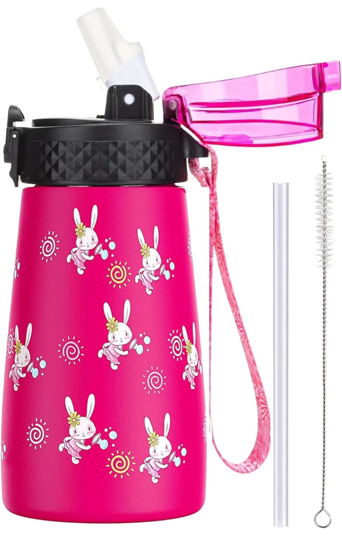12 oz Kids Water Bottle with Straw Lid & Spout Lid Vacuum Insulated Stainless Steel Cup Double Wall Kids Metal Water Bottles For School Boys Girls (Rose Rabbit 2 Lids)