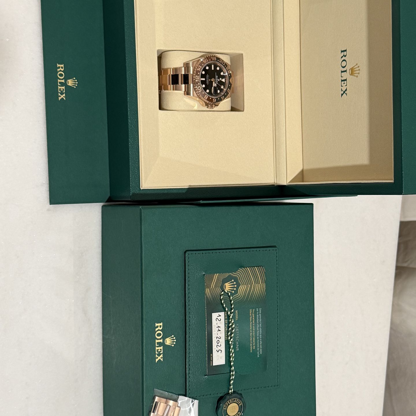 Up for sale is a brand new, unworn Rolex GMT-Master II “Root Beer” Ref. 126715CHNR in solid 18k Everose gold. This is the full gold version — not two-tone — and represents one of the most striking and luxurious GMT models in the current Rolex lineup. The warm Everose gold case and Oyster bracelet paired with the black and brown Cerachrom bezel create a bold yet refined presence on the wrist. It is powered by Rolex’s in-house Caliber 3285 movement with approximately a 70-hour power reserve. This watch is in true brand-new condition and has never been worn. There are no scratches, marks, or blemishes on the case, crystal, bezel, or bracelet. At the time of purchase, the bracelet was professionally sized at the authorized dealer and two links were removed. The watch itself has never been worn, and the removed links are included in the sale, allowing the bracelet to be returned to full factory size. Watch Details: Brand: Rolex Model: GMT-Master II Reference: 126715CHNR Case Size: 40mm Material: Solid 18k Everose Gold (case & bracelet) Bezel: Black & brown Cerachrom ceramic, bidirectional 24-hour Movement: Rolex Caliber 3285 (automatic) Power Reserve: ~70 hours Bracelet: 18k Everose Gold Oyster bracelet with Easylink extension Water Resistance: 100 meters Included: Original Rolex box Warranty card Booklets/manuals All original packaging Extra links (2 removed links included) This is an opportunity to acquire a high-demand, full Everose gold Root Beer in unworn condition without the boutique wait. A powerful yet elegant statement piece and a standout addition to any serious collection. Serious inquiries only. Happy to provide additional photos upon request.