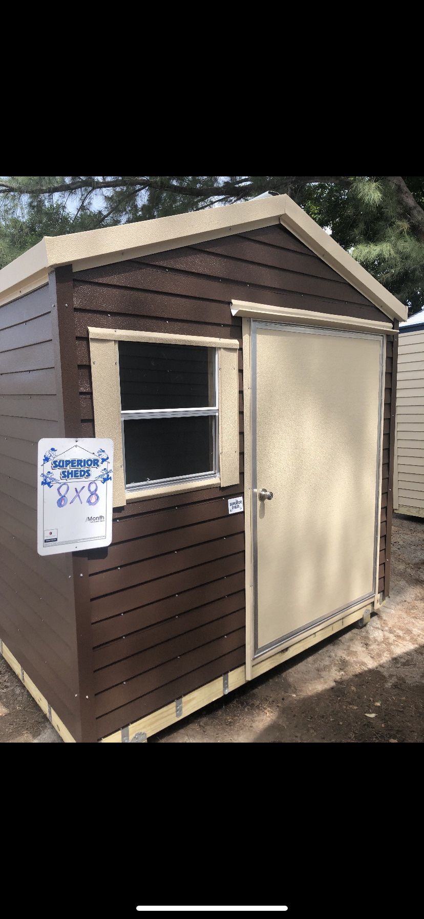 This is autumn brown and beige 8x8 shed with 1 window and a 48x72 door. We have a special program that is rent to own and finance. For more info contact us at (contact info removed)