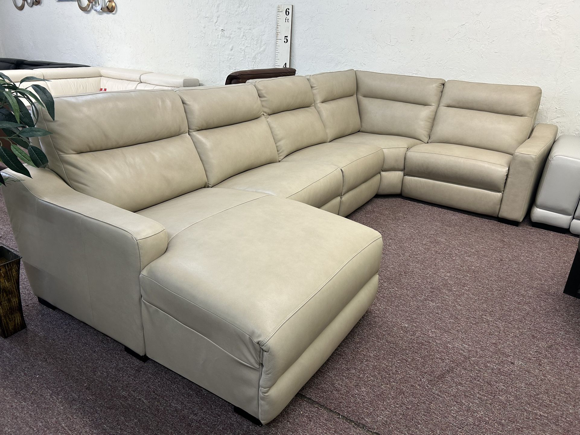 119"W x 119"D x 39.5"H Retail price: $6,445 The Gabrine with its full dense foam, buttery smooth leather, lumbar support and powered recliners provides high comfort and support paired with durability and quality. The switch panels are located on each inner sides. The option for chaise on either side is available. Delivery available Financing available Store display item