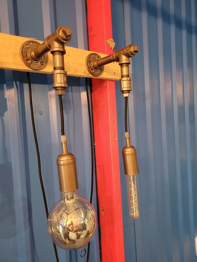 Custom steel pipe lighting 100 with out bulbs 150 with bulbs. Also steel pipe shelves with barn wood 150 ea