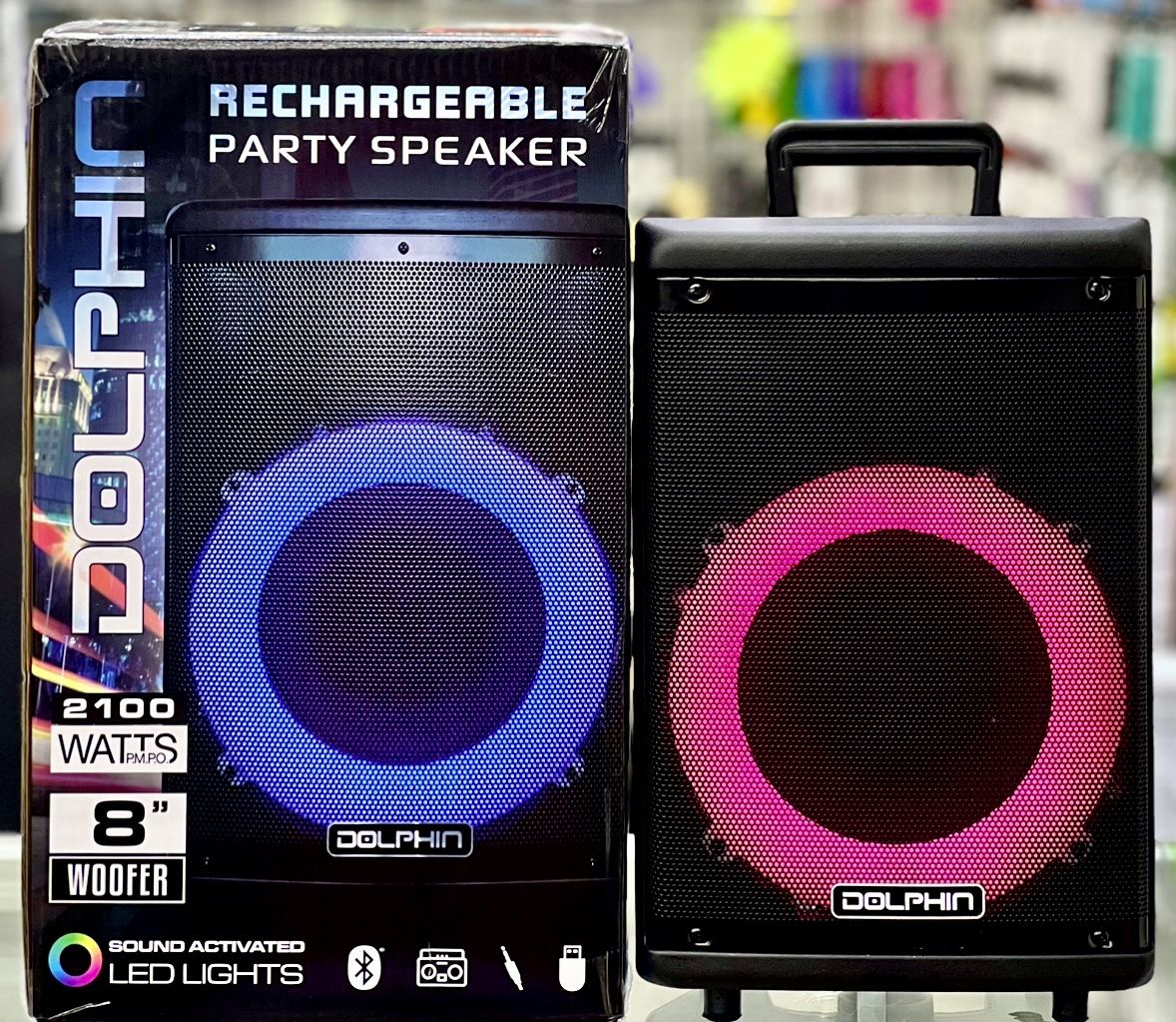 - rechargeable - Bluetooth - Ring lights - 8” woofers - 2100 watts - Handle to carry - Wave sync