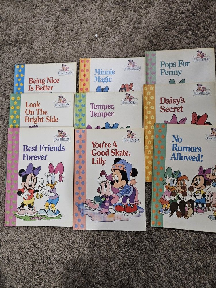 Complete set of 24 minnie & me bestfriend collection books. All hardcover copyright in 1991. All books have spine use/damage. 3 books have a name written in it. All books show discolorization on the white part of cover. No ripped pages or writing on pages or books besides whats stated. I enjoyed these when i was a kid then read them 2 my daughter when she was born. For the time they werent being used which was a total of 20 years they have been stored in a bin with other books. Time to let a new family enjoy these wonderful books. Cash only & will meet @ mequon PD 4 exchange. Ne ?s plz ask.