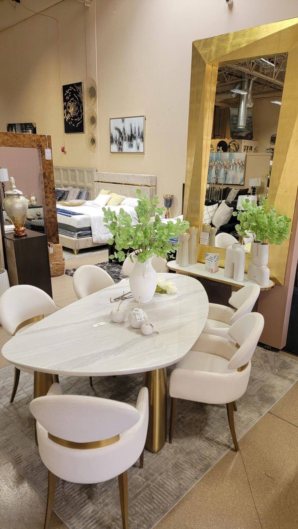 Sale... Sale.. 5 pc Contemporary White/ Matte Gold Dining Table Set From $2799 Today Special $2299! Includes Dining Table and 4 Arm Chair. 7 pc Dining Table Set Special $2859 includes diningtable and 6 chairs, Dining Table Special $1299 and Chair Special $259. Dimensions: 79" x 43.5" x 29.5"H. Features: • Contemporary • White/Matte Gold • Sintered Stone, Stainless Steel, Fabric, Foam • Unique Table Design w/ Soft Curved Edge • Sintered Stone Table Top • 3-Legs Base • Stainless Steel Legs w/ Matte Gold Finish • Upholstered Arm Chair w/ Gold Accents **EVERYONE QUALIFIES** ** NO CREDIT NEED IT** ** 90 DAY PURCHASE OPTION** **SHOP NOW, PAY LATER, ALL WITH OUT CREDIT*** Monday to Saturday 10:00 am to 7:00 pm Sunday 10:00 am to 5:00 pm. **INVENTORY CHANGES DAILY MESSAGE FOR MORE DETAILS. sofa, chaise, couch, love seat, fabrics, colors, comfortable, sectional, chair, living room, family room, coffee table, End Table, TV stand, Credenza, cabinet, Furniture, Dining Table, Wood, Modern, dinette, Patio, glass, metal, Stool, Lounge, Desk, Murphy Bed, Accent, Bar, Bunk Bed, Daybed, Buffet, china Hutch, kitchen, Console, Sideboard, Folding, Accent, office, decor, rug, plant, home, house, server, flower, mirror, marble, fireplace, velvet, art, picture, wall, paint, counter, ottoman, bookshelf, desk, file, base, bench, chest, dresser, headboard, mattress, memory, foam, spring, armoire, curio, lamp, light, led,
