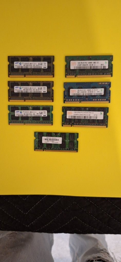 LAPTOP MEMORY - DDR2 & DDR3 From $5 and up. All working pulls from upgraded laptops Current Inventory as of 02/22/25 $5 - 1GB PC2-4200S - HYNIX $5 - 1GB PC2-6400S - HYNIX $7 - 1GB PC3-8500S - SAMSUNG $7 - 1GB PC3-8500S - SAMSUNG $7 - 1GB PC3-10600S - HYNIX $10 - 2GB PC3-8500S - ELPIDA $12 - 2GB PC3-8500S - SAMSUNG $12 - 2GB PC3-8500S - SAMSUNG $12 - 2GB PC3-10600S - SAMSUNG $12 - 2GB PC3-10600S - NANYA $12 - 2GB PC3-10600S - NANYA No Zelle or other cash apps, please.