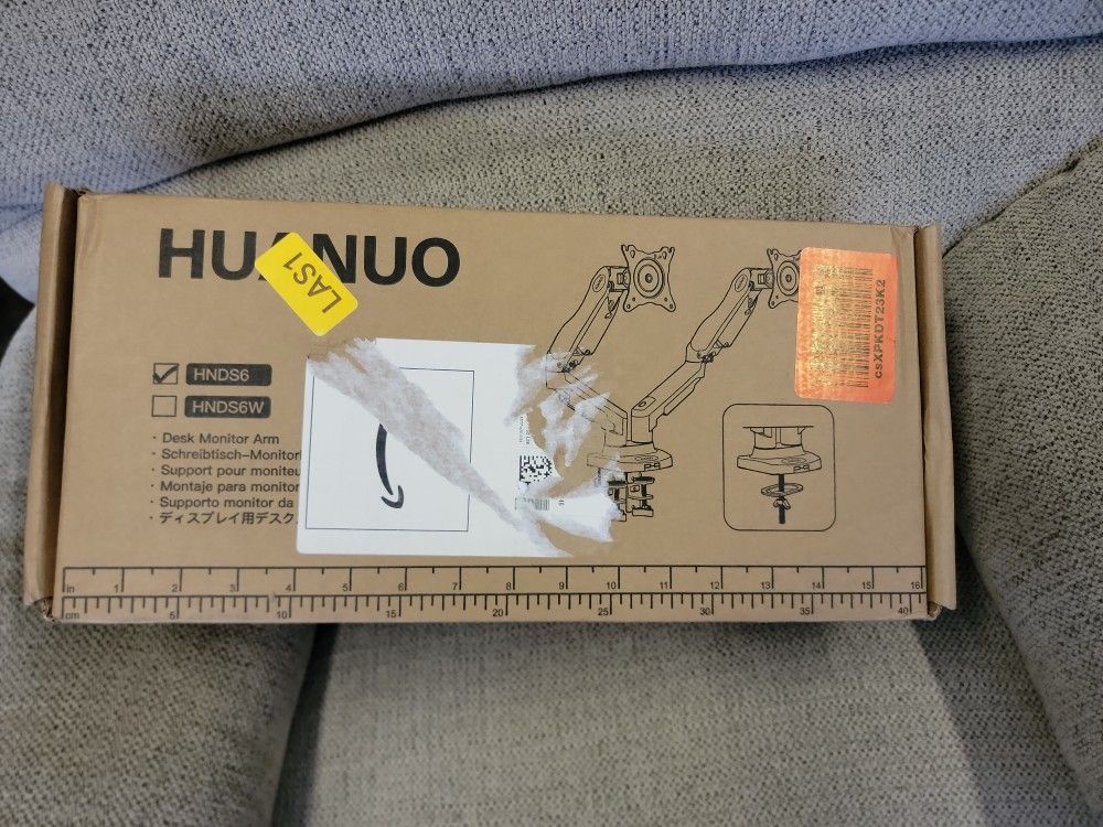 Never got around to using it. I included the Amazon listing. All parts fully accounted for. Never opened except to take photo. Model HNDS6. Dual Desk Monitor Arm.