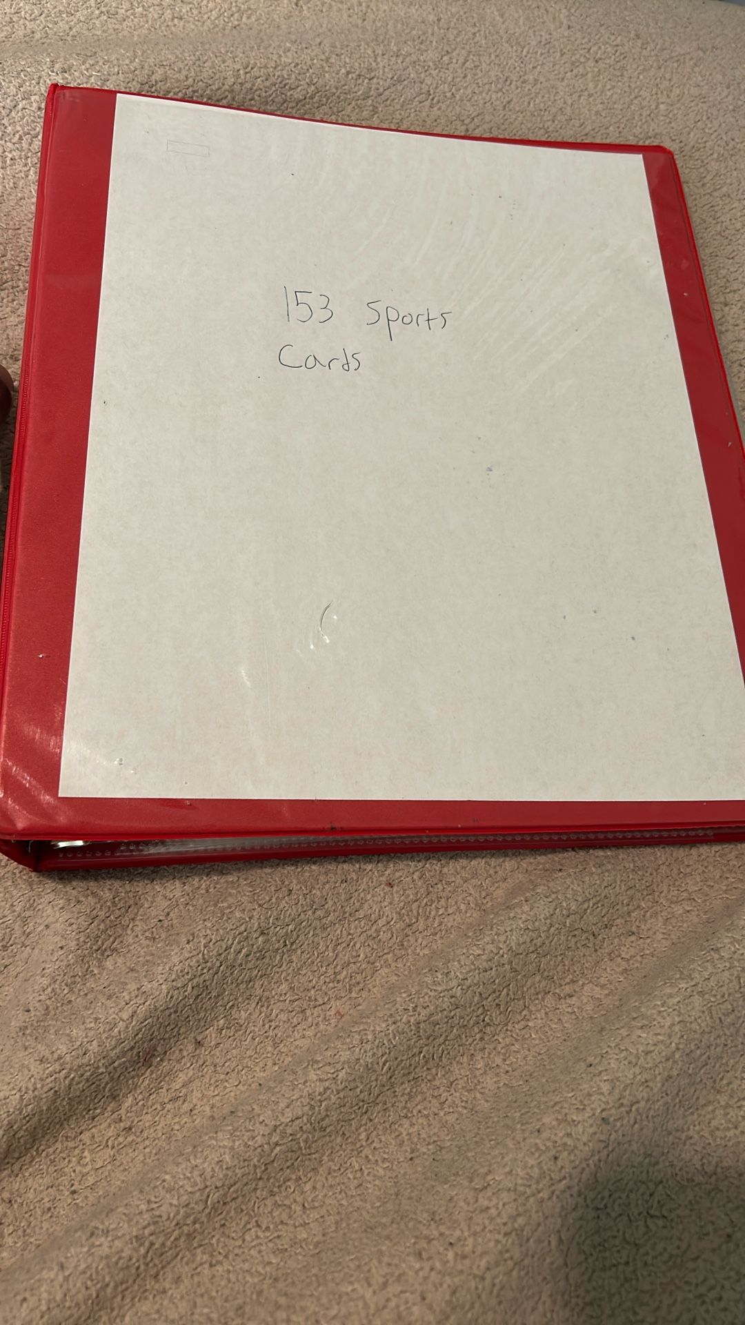 Red sports card binder which contains a lot of Basketball π cards, some π football, and some baseball. βΎοΈ Holds about 153 cards total.