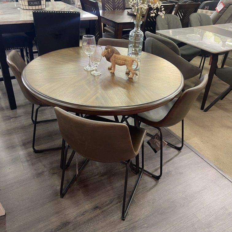 5pc set includes: 1 round table and 4 side chairs Chairs: Tubular black metal base Bucket seat Brown Faux leather upholstery Table: Round dining table Tabletop made with mindi veneer and engineered wood Metal base with brushed dark bronze-tone finish Chair: 19.13" x 19" x 31.25"H Table: 45.38" Dia x 30.5"H Shop online at ornatehome.com Enjoy unlimited item delivery for only $99. Explore our wide range of furniture options, including dining room sets, bedroom furniture, sectionals, sofas, recliners, sleeper sofas, rugs, wall art, mattresses, bedding, kids' room furniture, office furniture, vanities, bookcases, and much more. We proudly carry brands such as Ashley Furniture, Tempur-Pedic, Sealy, and Stearns & Foster.