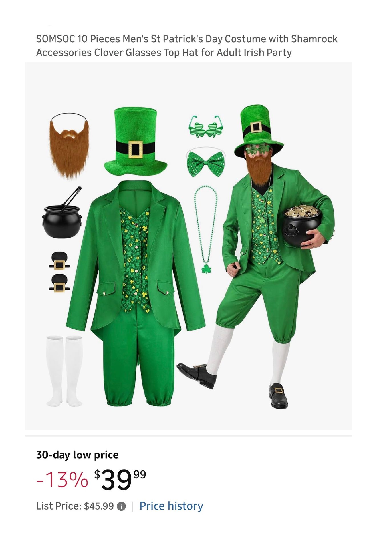 I am selling a brand new, never-worn, still in the packaging, Men’s size large, 10-piece St. Patrick's Day costume with all accessories. This is selling on Amazon for $40 plus tax, totaling $46. With St. Patrick's Day coming up in a few weeks, I'm pricing this to sell. About this item *10 Pcs St Patrick's Day Costume: This St Patrick's Day costume set includes a tailcoat jacket, pants, top hat, shamrock glasses, brown fake beard, green necklace, bow tie, shoe covers, white socks, and a black round cauldron, 10 essential pieces for a complete festive look. *Superior Quality: Crafted from superior material, every piece in this St. Paddy's costume set combines comfort and resilience. The tailcoat jacket and pants are lightweight and breathable, while the accessories are sturdy for multiple uses. *Delicate Accessories: The set features vibrant shamrock glasses, a soft green bow tie, a lucky four-leaf clover necklace, a novelty brown beard, and a classic top hat, adding unique Irish flair to your outfit and making you stand out at any party or event. *Size Information: This is a size LARGE and the adult-sized tailcoat and pants are designed to fit most men from M to XL. Accessories come in one size fits most, offering easy wear and a comfortable experience for all. *Versatile Occasion: This costume set is great for St. Patrick’s Day parades, Irish parties, cosplay events, themed gatherings, role play, stage performances, and more. Make every festival or fun night extraordinary with this all-in-one St. Patrick's costume set.