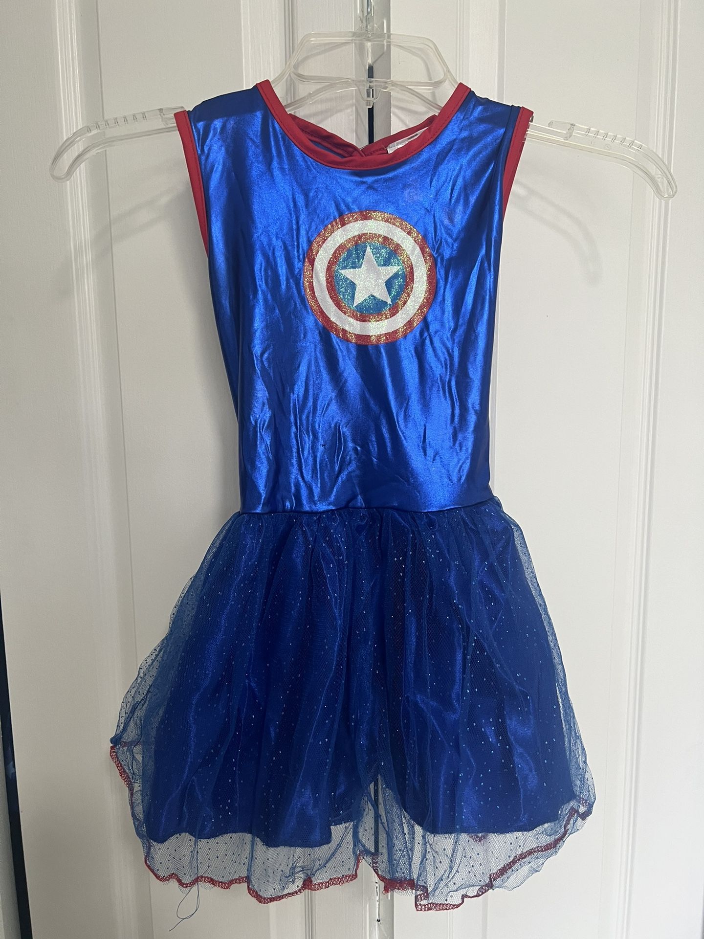 Like new girl’s Captain America dress, cape, cuffs, & mask