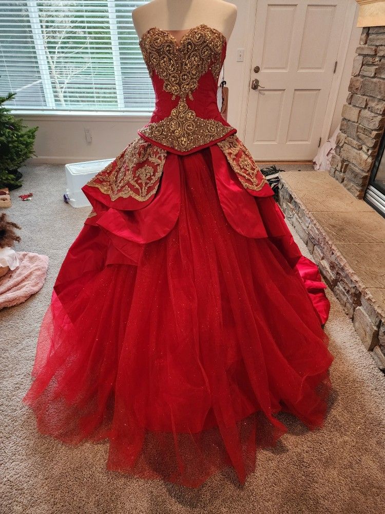 Breathtakingly red and gold formal with amazing detail and train! Brand new and ready for your photo session! Amazing Ragazza - Noir collection. Retails at $1,500, OfferUp price $1150 or best offer! *Dress is currently showing without a hoop skirt, provided and even more amazing once it's on! Size 9