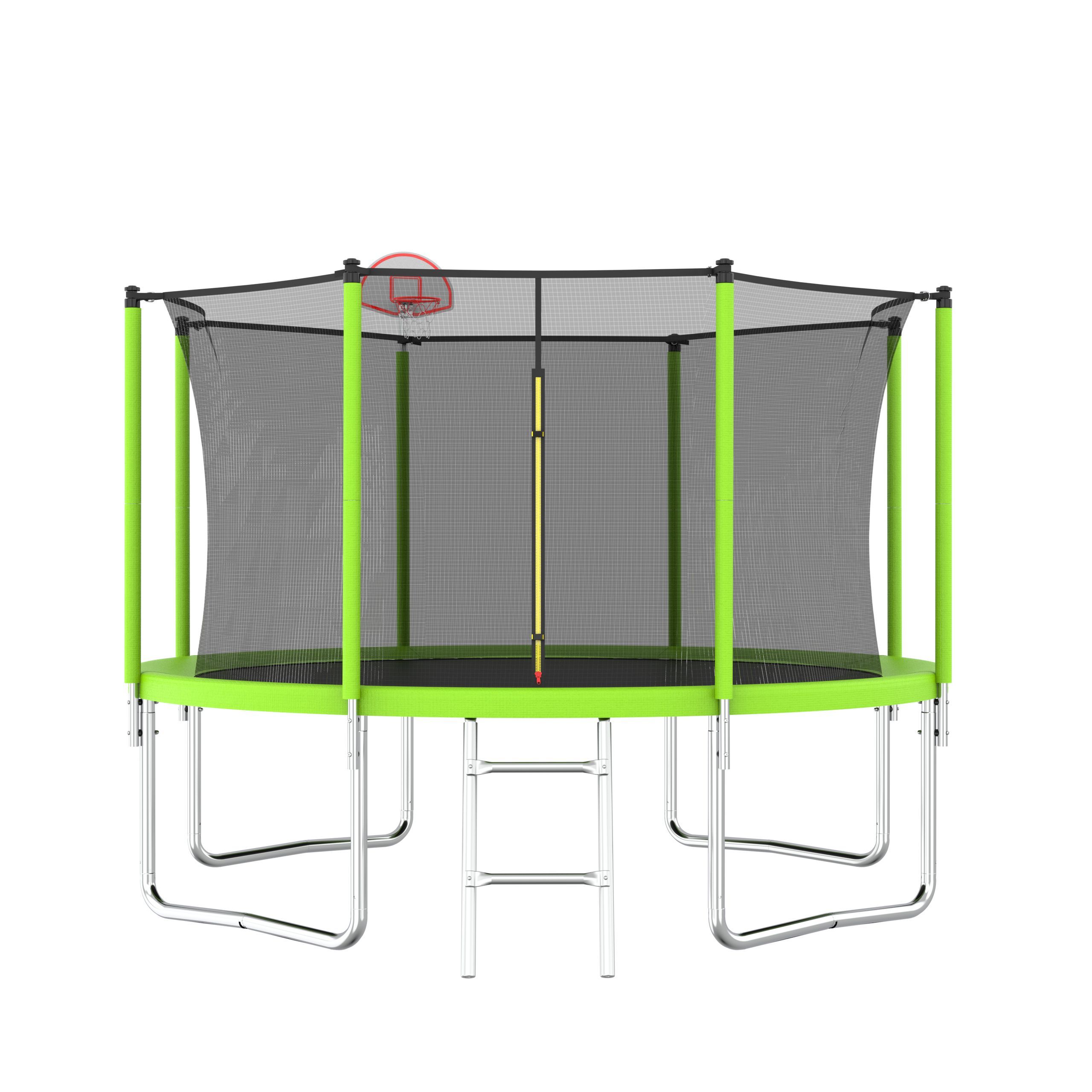 12FT Trampoline Green for Kids & Adults with Basketball Hoop and Ball ,Recreational Trampolines with Safety Enclosure for Back Yard Outdoor Length (in.): 58.66 Width (in.): 18.11 Height (in.): 11.81 Weight (lbs.): 125.96 12 FT Trampoline is equipt with 8 high safety enclosure poles and heavy gauge galvanized rust resistance steel construction. 4 W-shaped legs secure stability. For the safety of every user, we have ensured that our recreational trampoline meets ASTM and CPC standard safety specifications 72 rust-resistant galvanized trampoline springs securely attach the tightly woven jumping mat and frame together, offering superior and impressive bounce. The jumping mat is made of PP material with premium elasticity-back property allowing kids to jump higher and merrier. 8 foam padded poles to support UV-proof safety trampoline enclosure net for maximum safety while jumping. Heavy duty 3-step galvanized steel ladder offers convenient maneuverability in and out of the trampoline. Total weight capacity is up to 880LBS. NOTE: to avoid the jumping mat reaching the ground cause injuries, SINGLE person's weight limit is 220LBS. Children please use the trampoline under the supervision of an adult to ensure safety. 100% Satisfaction Service-One order gets all accessories .The specific assembly steps are shown in picture form which is easy for you to understand. This trampoline comes in 1 large box, if the box arrives damaged or parts missing, contact us and we will reply in time. K1163139545 CA3