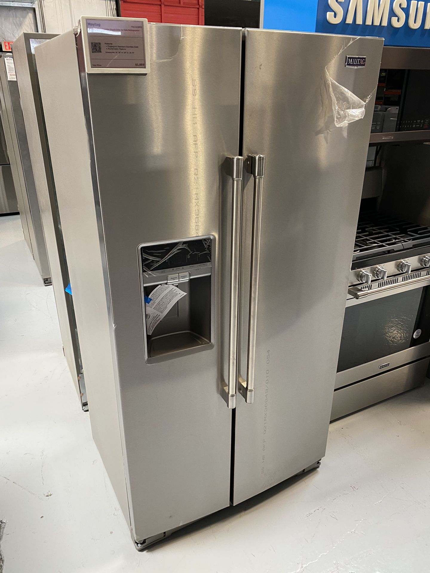 New Open Box MayTag Stainless Steel 36” Wide Counter Depth Side-by-Side Refrigerator - 21 Cu. Ft. Model #MSC21C6MFZ Dimensions: 36”W 29.75”D 69”H Fingerprint Resistant Stainless Steel PowerCold Feature Store-N-Door Ice Dispensing System BrightSeries LED Lighting Gallon Door Bins Includes a 12-month warranty Financing Available Delivery and installation available Contact us with any questions or to stop by to see this unit and others. Open Monday - Saturday 10am - 6pm Our inventory changes daily. Message us for availability.