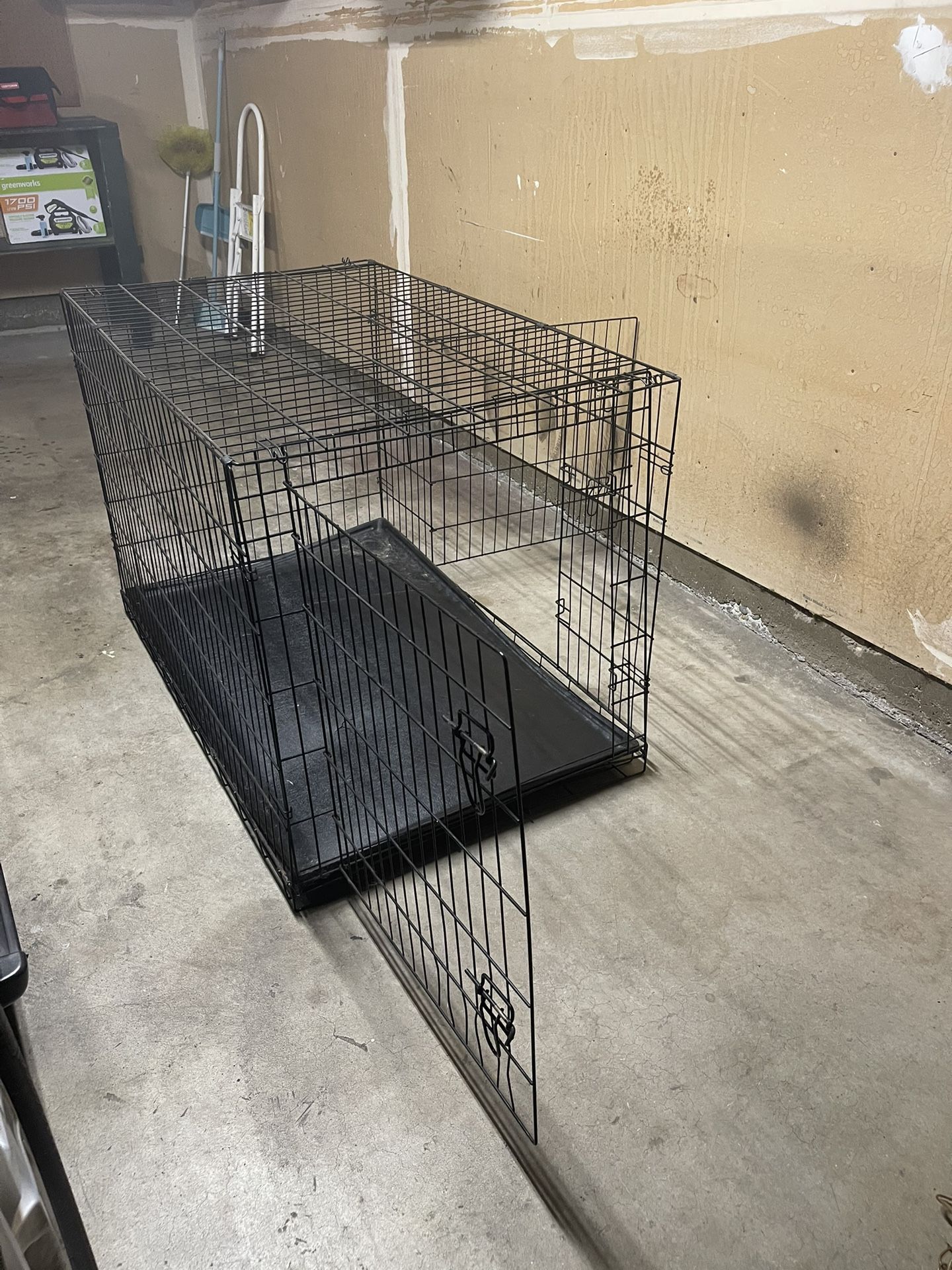 Large foldable wire dog crate. Has 2 door entrances. Plastic bottom pad is bent slightly and has a rip, so you can either take it or not. 47” L x 29” W x 31” H. Great condition! $35 OBO