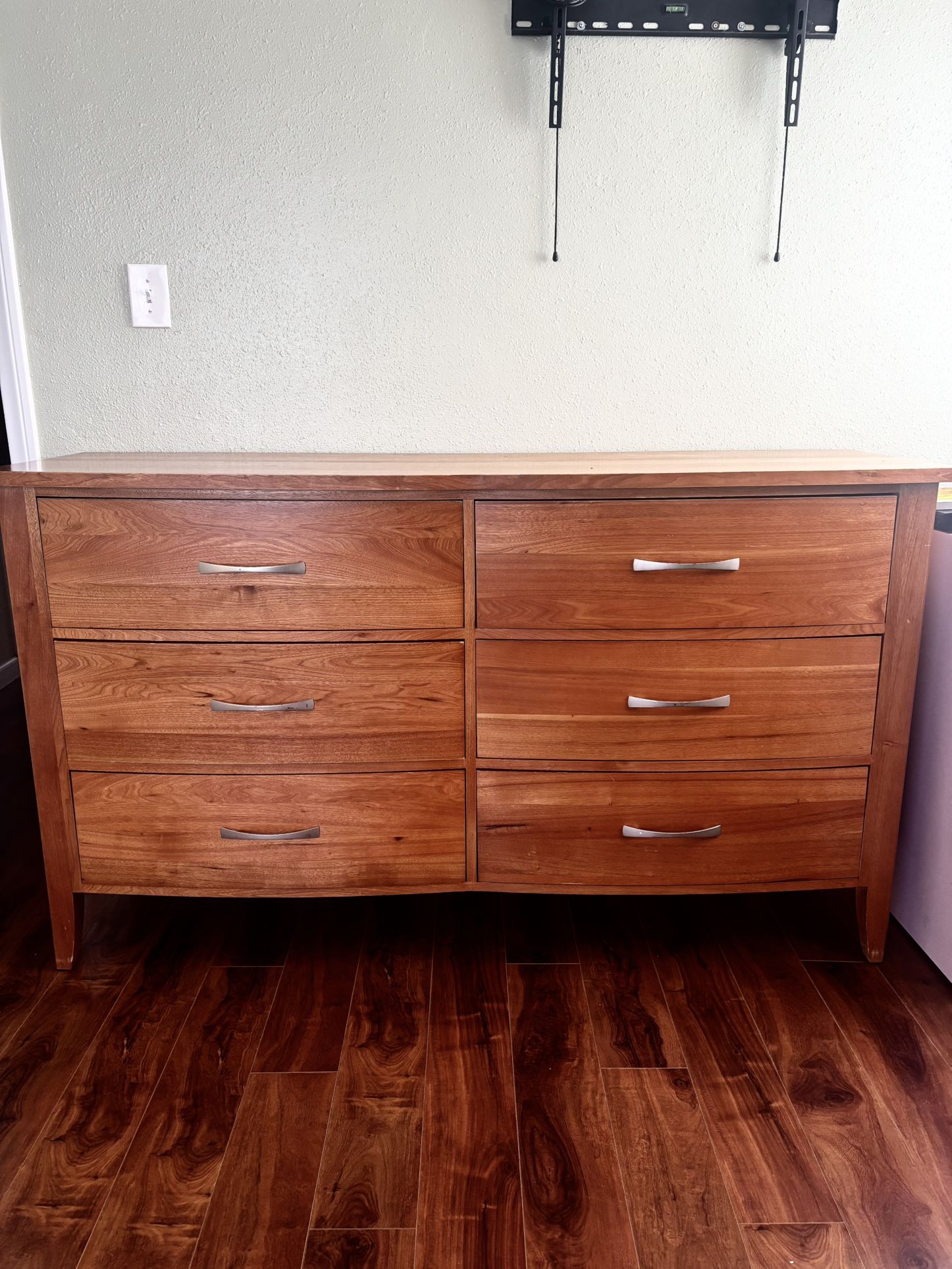 Mirror never used (brackets to hand on wall) Dresser normal use Minor stains on top Length 66" Width 20 1/4" Height 38 1/4".