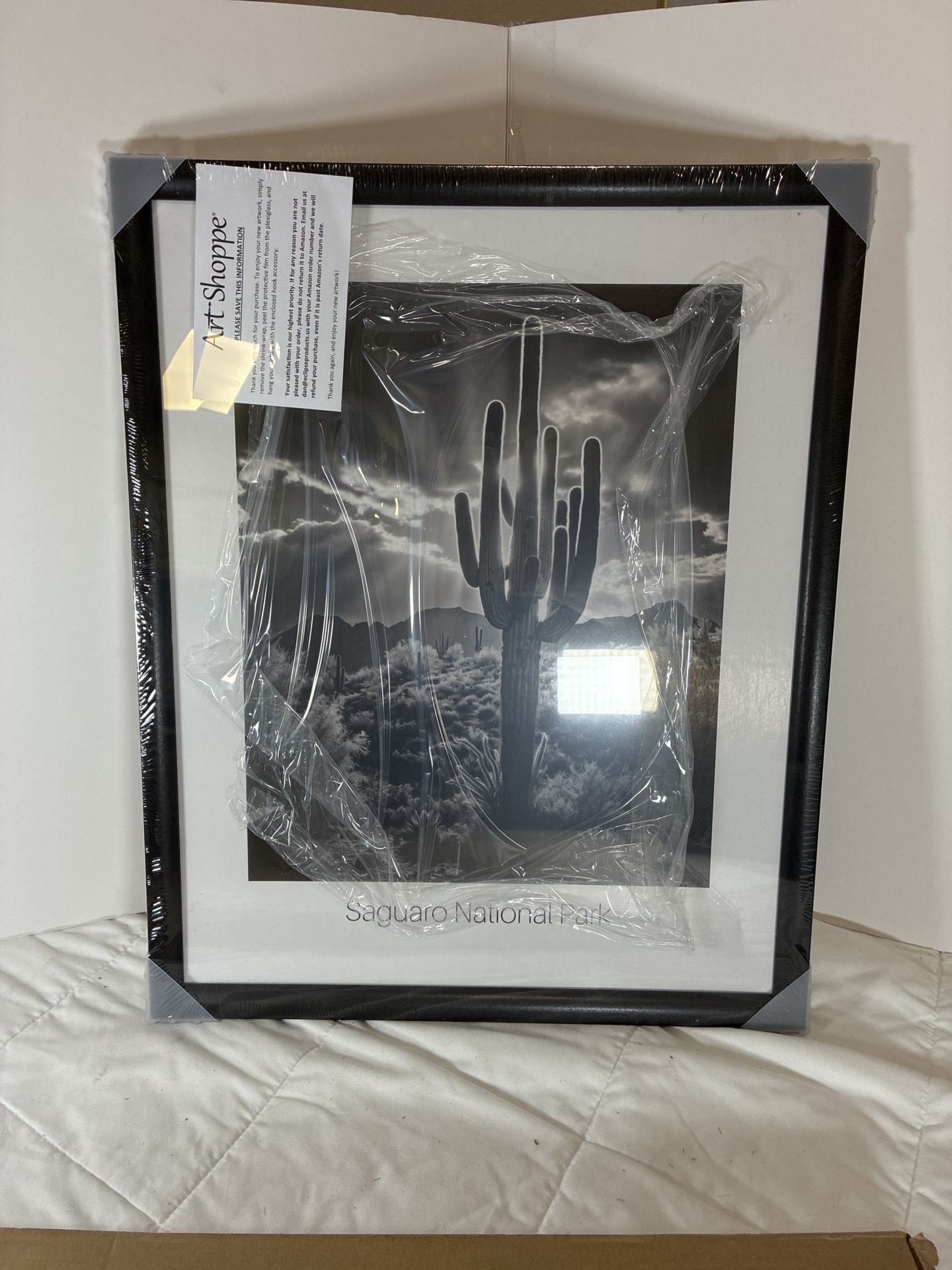 Condition: New – Open Box Framed black and white desert landscape featuring Saguaro National Park. • Black frame with white mat • Modern southwest décor • Ready to hang • Protective wrap attached Ideal for minimalist or southwestern interiors. Ships securely packaged.