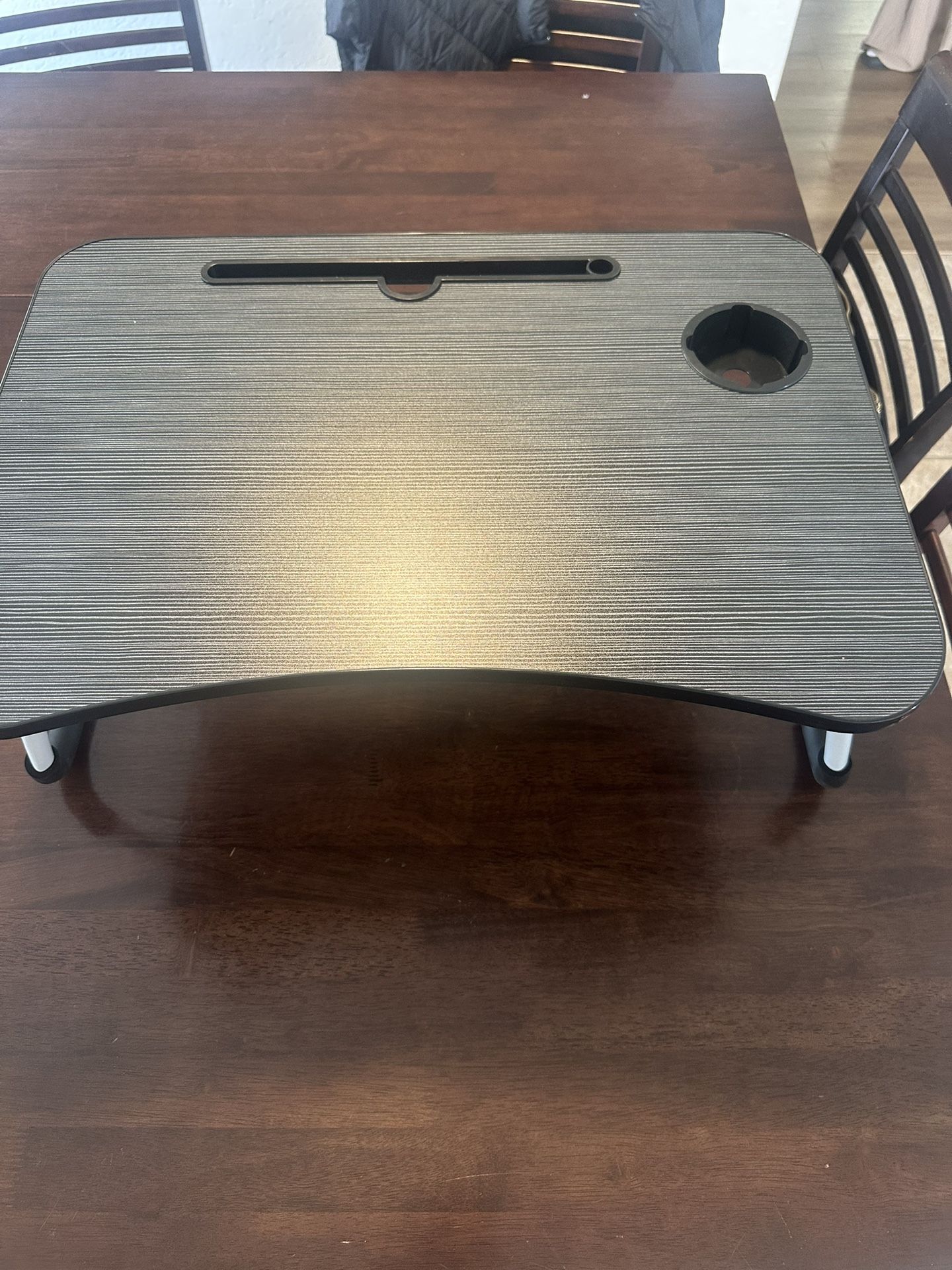 Portable folding laptop tray table in great condition. Perfect for using a laptop, tablet, reading, or eating while sitting on the couch or in bed. Features: • Built-in tablet/phone slot • Cup holder for drinks • Folding legs for easy storage • Lightweight and portable • Durable wood-style surface with metal legs Great for working from home, studying, breakfast in bed, or watching movies.