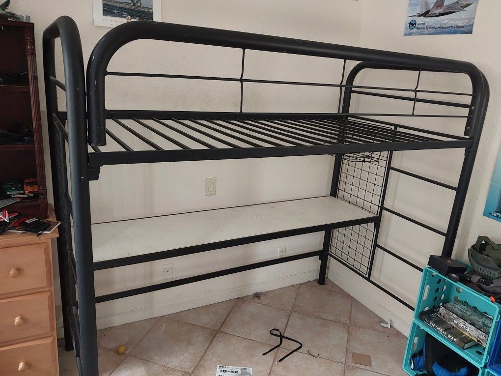 Twin loft bed with desk underneath. It has some wear but is still very solid.