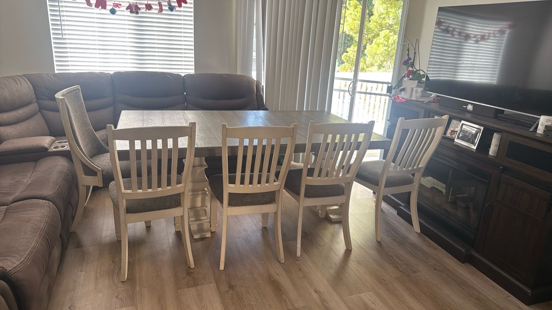 Beautiful Used Family Dining Table – Extends Out Well-loved family dining table with extension, perfect for gatherings and holiday meals. Table and chairs are real wood and in good, fair condition. Comes with a total of 8 chairs. There is very minor paint on the tabletop from kids’ coloring, but nothing that affects use or appearance. Overall, it’s sturdy, functional, and ready for many more family memories—perfect for a Christmas gathering. Selling as-is. Price is negotiable for serious buyers only, please.