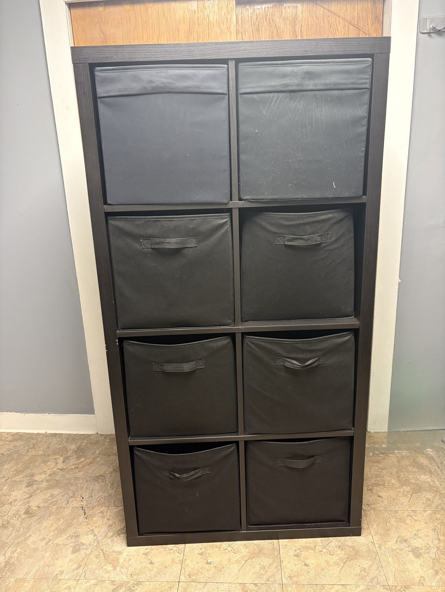 Selling a black IKEA Kallax shelf unit with 8 inserts. It's in good condition and perfect for organizing any room. There are some minor signs of wear, but it's still very sturdy and functional! Great for storing books, toys, or clothes
