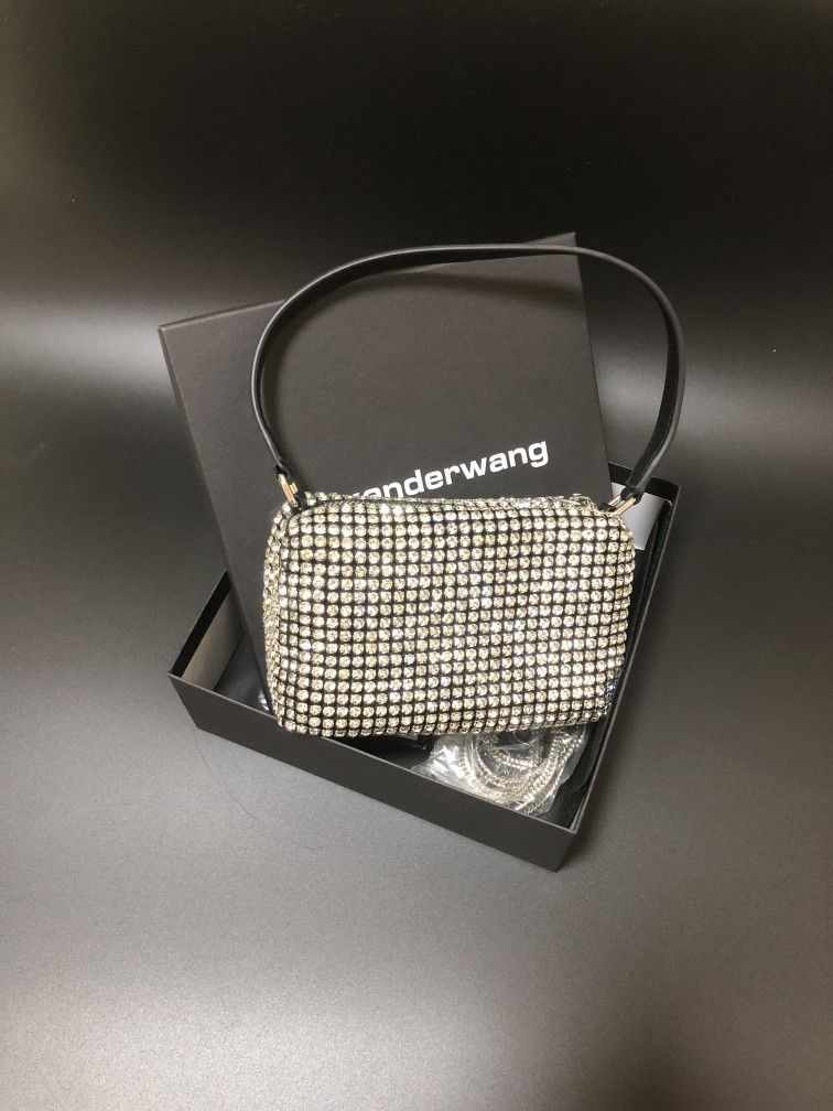 New, never used! Comes with dust bag,extra rhinestones, strap and box. medium-sized pouch bag in white crystal rhinestone chain mesh with a logo embossed top handle polyester lining top zip closure interior leather logo patch embossed contrast logo at strap 80% crystal glass, 20% cowhide dimensions: 17 x 10 x 7 cm
