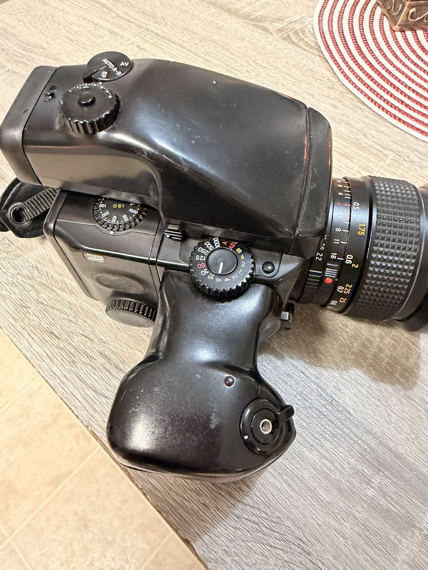 Mamyia 645 pro with metered EVF and 3 120 backs and a 220 back. Sekor C 45mm 2.8 Film was sold, so no film included.