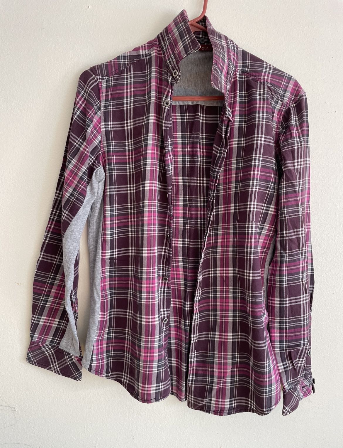 This is a plaid shirt with a patchwork design. • Main color: It features a classic plaid pattern interwoven with purple, pink, white, and black (deep purple). • Back cut: The upper part of the back, the yoke section, is cut diagonally (Bias cut), which visually adds some design elements and breaks the monotony of a single vertical plaid. 2. Unique patchwork design • Side seam patching: The most distinctive feature of this garment is that the sides of the body and the inner side of the sleeves are sewn with gray knitted fabric. • This design is usually to increase elasticity and comfort. Plaid fabric is typically a non-elastic woven fabric, and adding this knitted patching makes it more flexible to move and also gives the overall style a touch of casual sportswear (Hybrid style). • Collar: Standard lapel design. • Sleeve opening: Shirt sleeves with buttons. • Material speculation: The main body of the shirt is likely made of cotton or a blend of cotton and polyester, and the gray part on the side might be a blend of cotton and spandex. Wearing suggestions: Since it combines the plaid pattern of a formal shirt and the comfort elements of a hoodie, it is very suitable as an outerwear. You can wear a simple white T-shirt inside and pair it with dark jeans or casual pants.