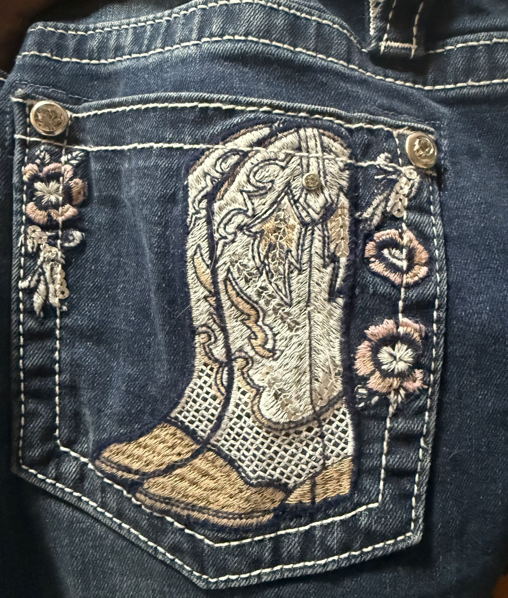 Boot designs on back pockets Size 13 Worn once Blue jeans Embroidered boots on pockets