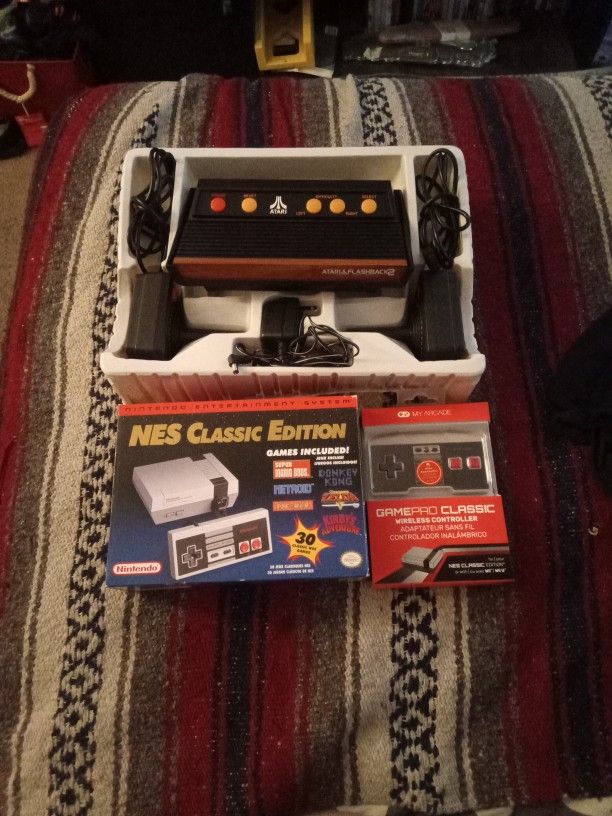 Vintage retro Nintendo game bundle. Brand new. Nes classic, Atari flashback 2, and gamepad classic controller. Selling as a lot. Vintage video games.