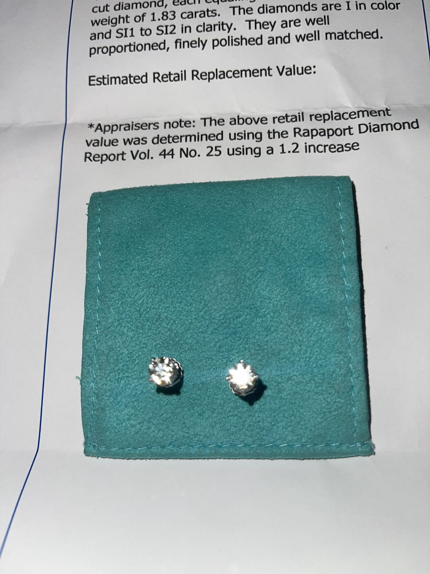 1.83 carat earrings, white gold, I color SI1-SI2 clarity. Appraised at $9,800