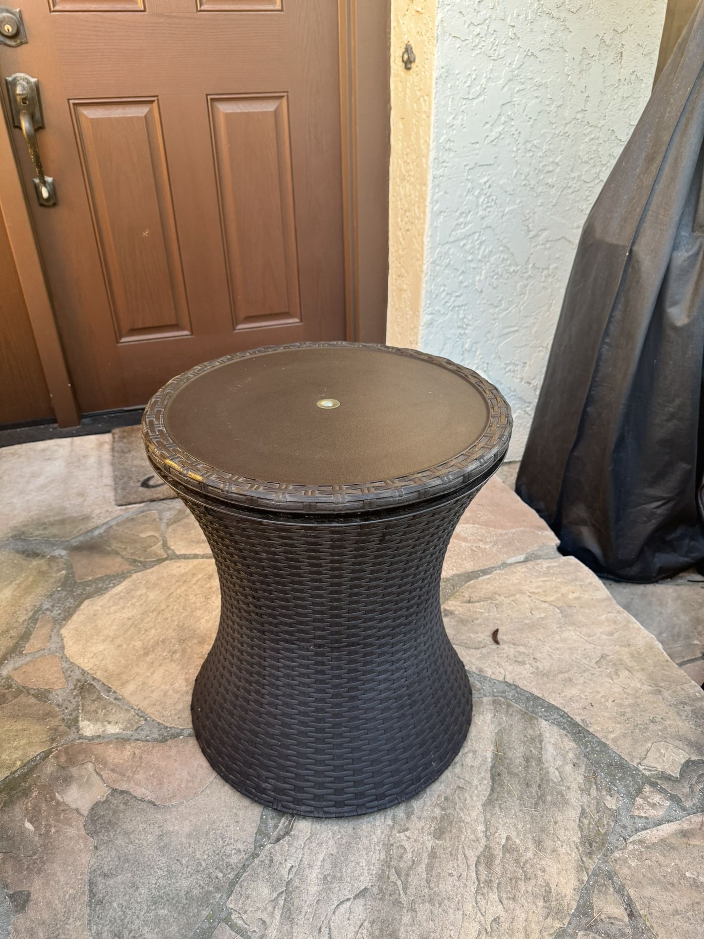 This outdoor resin table is a great addition to any backyard or patio. Perfect side table that converts to an ice cooler to save on trips back to the kitchen. It has an internal plug for quick drainage. Very sturdy. $50