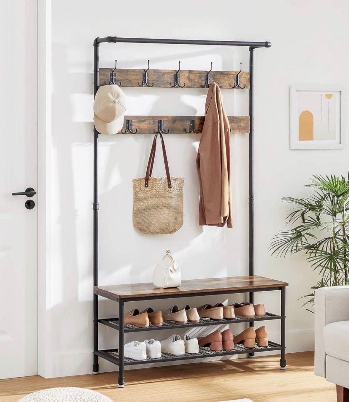 New in box 3-in-1 Entryway Coat Rack and Storage Bench, Pipe Style Hall Tree with 9 Hooks, Multifunctional, Sturdy Steel Frame, Large Size, Industrial, Rustic Brown and Black UHSR47BX