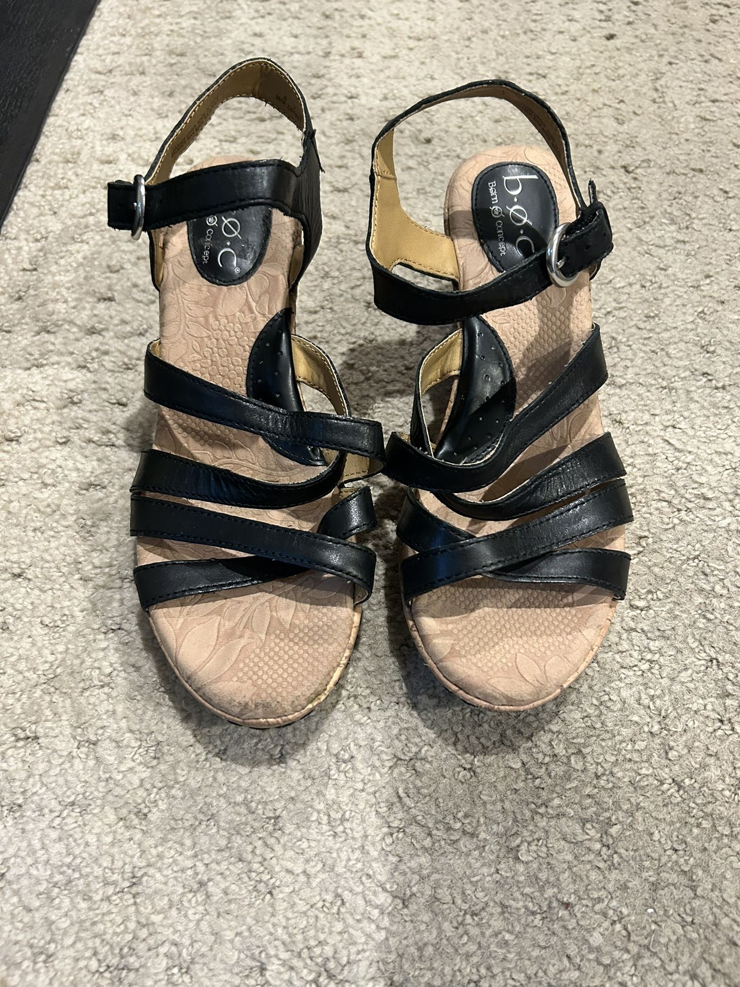 Born Concept (BOC) sandals with black leather straps and comfy shoe bed. Lightly worn - light wear noted near the toes and heel area of the sole. Overall they look great.