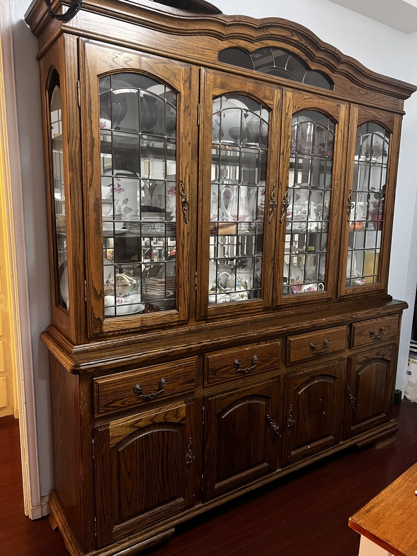 OBO, China cabinet with lighting in upper glass part of cabinet. Plenty of space for all your dinner ware and plus. Does have some scratches on each side on the edges as shown in the pictures which can be easily fixed. Measurements are 7ft H. , 6.4 ft length, 17.5 inches depth.