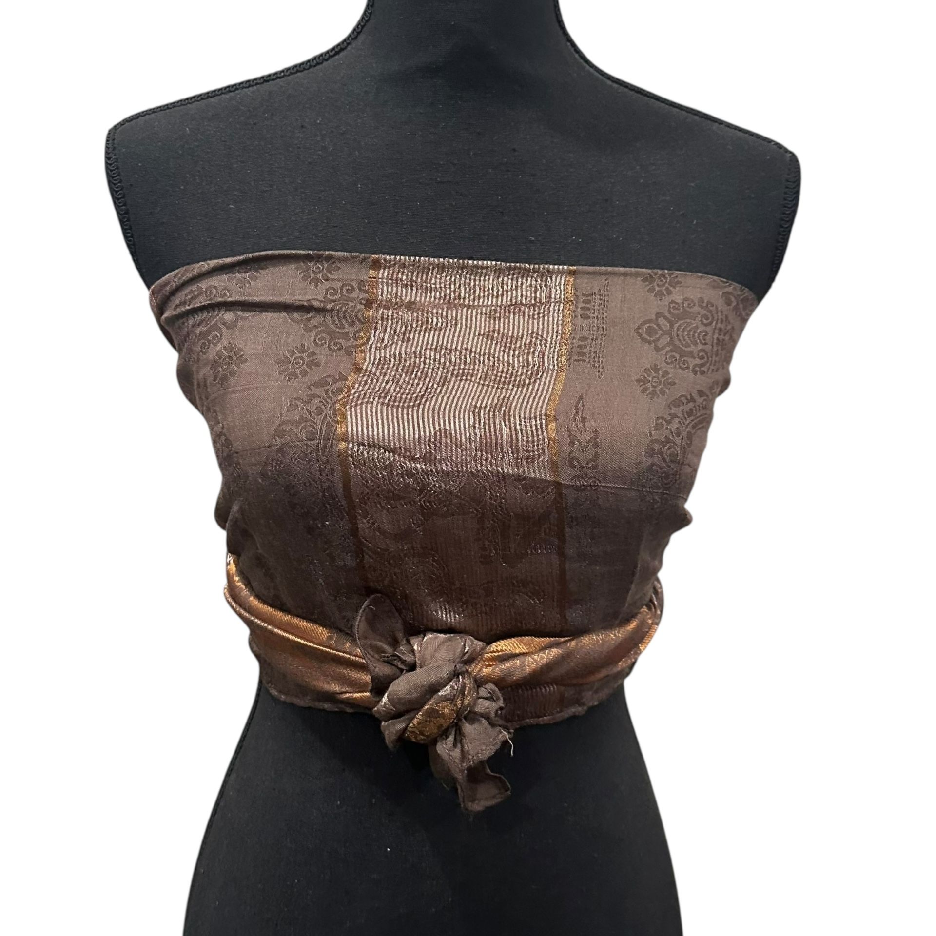 Sheer 100% silk scarf in rich brown and bronze tones with an elegant woven pattern.