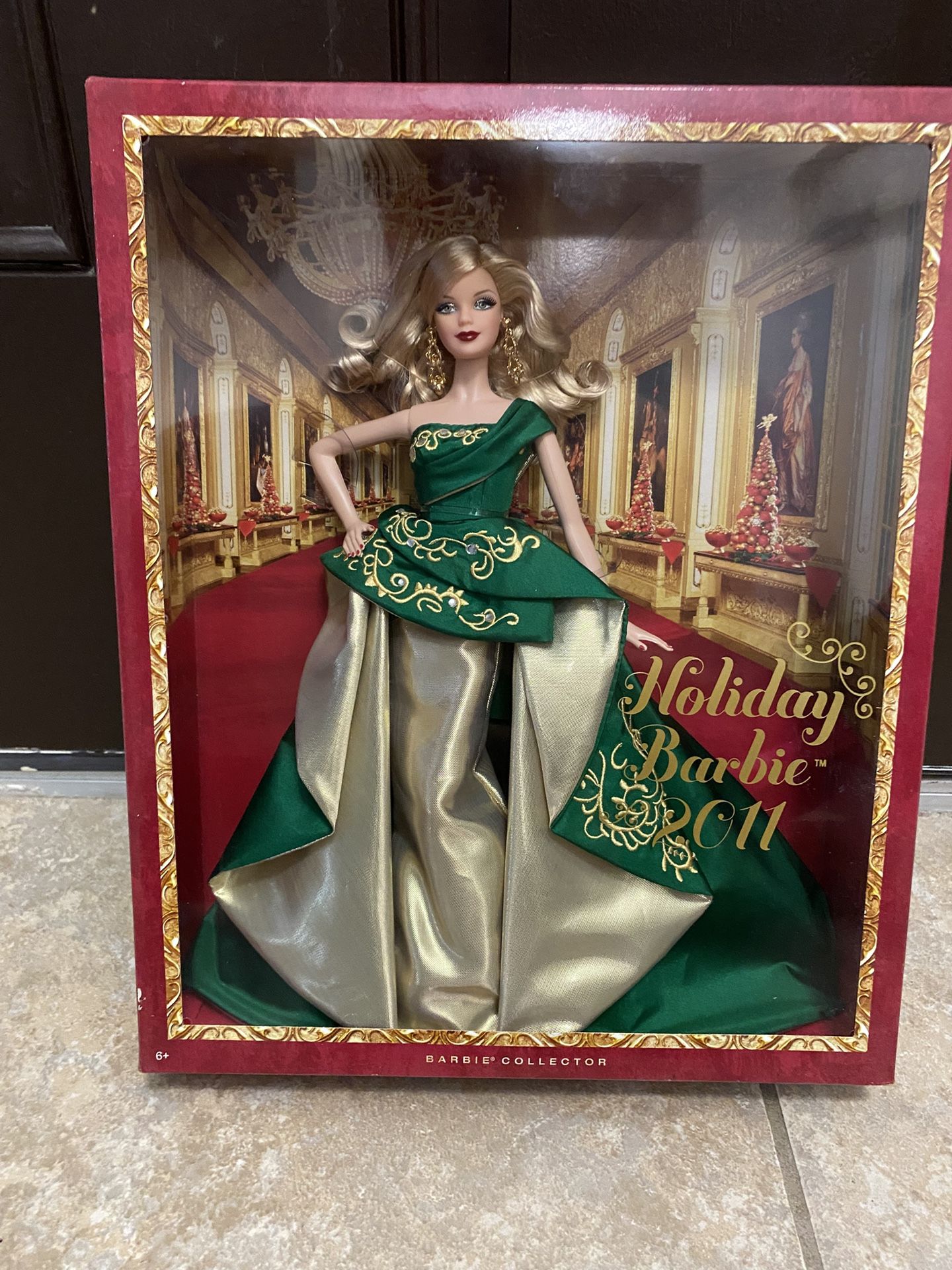 The 2011 Barbie collector holiday doll is a dress-up doll that features Barbie in a green long gown with a gold skirt and swaying earrings. The doll also has red nails and rouge.