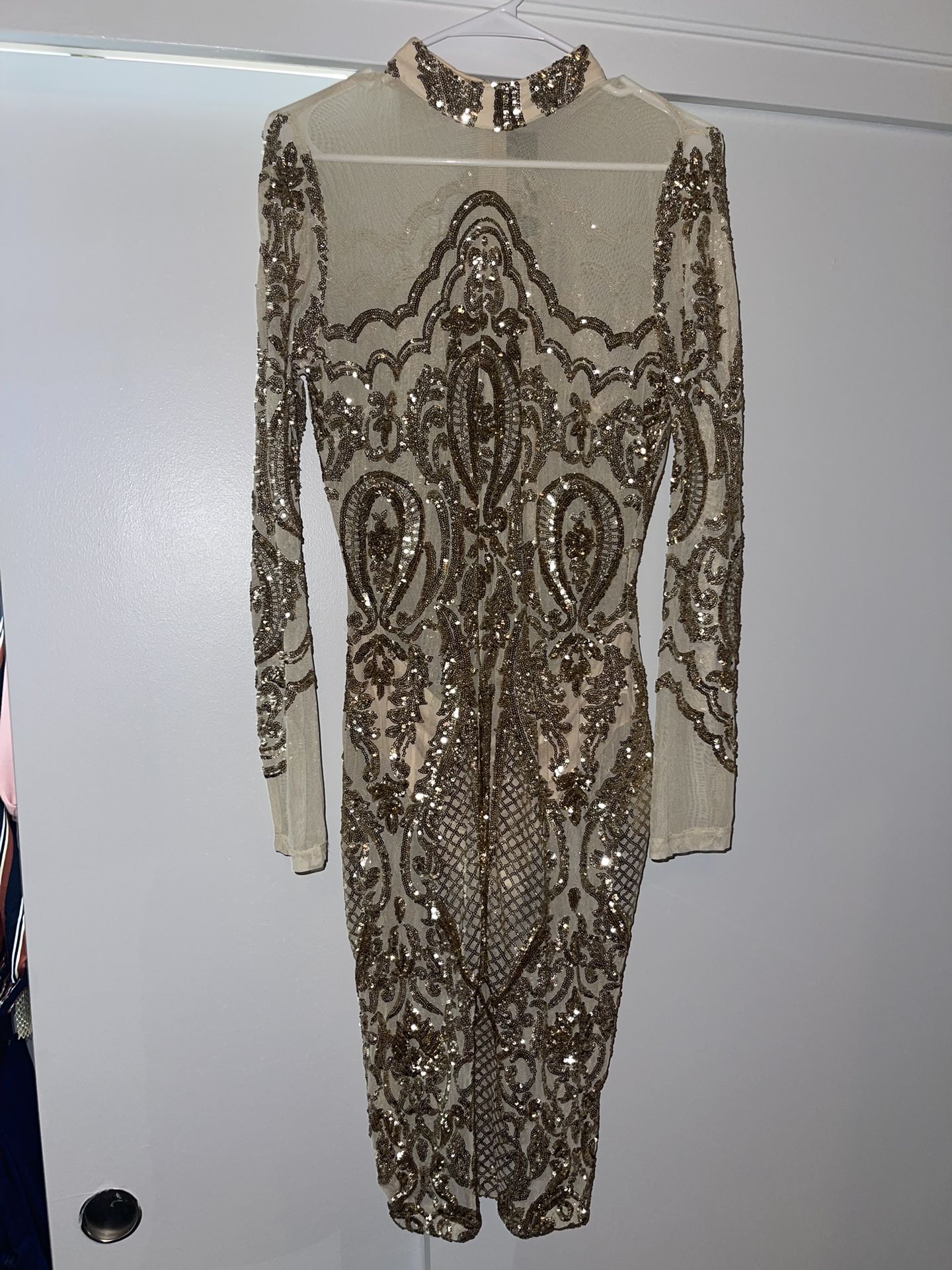 This dress is brand new, never been worn. Size Large. The dress does have stretch to it, but is limited because of the sequins. $25/OBO