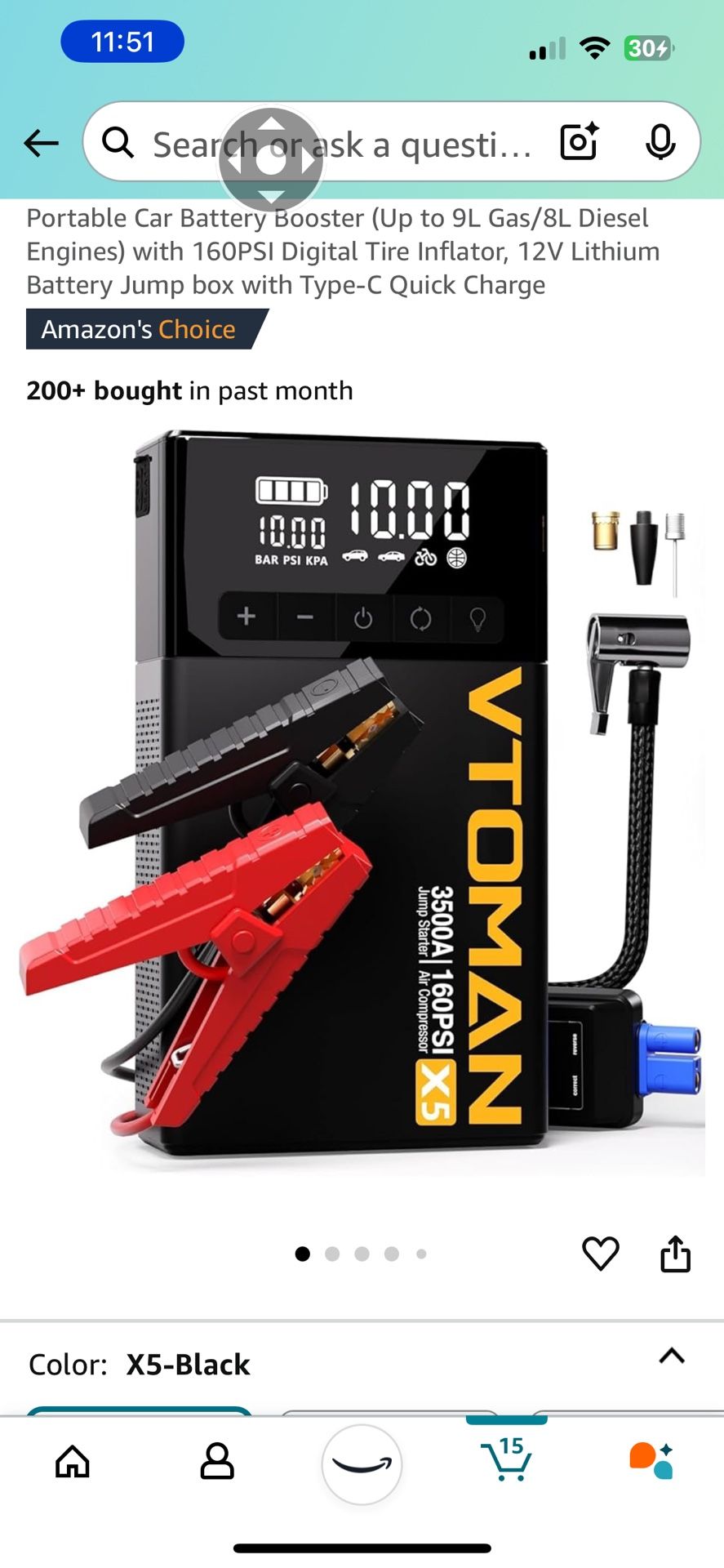 Portable Car Battery Booster (Up to 9L Gas/8L Diesel Engines) with 160PSI Digital Tire Inflator, 12V Lithium Battery Jump box with Type-C Quick Charge