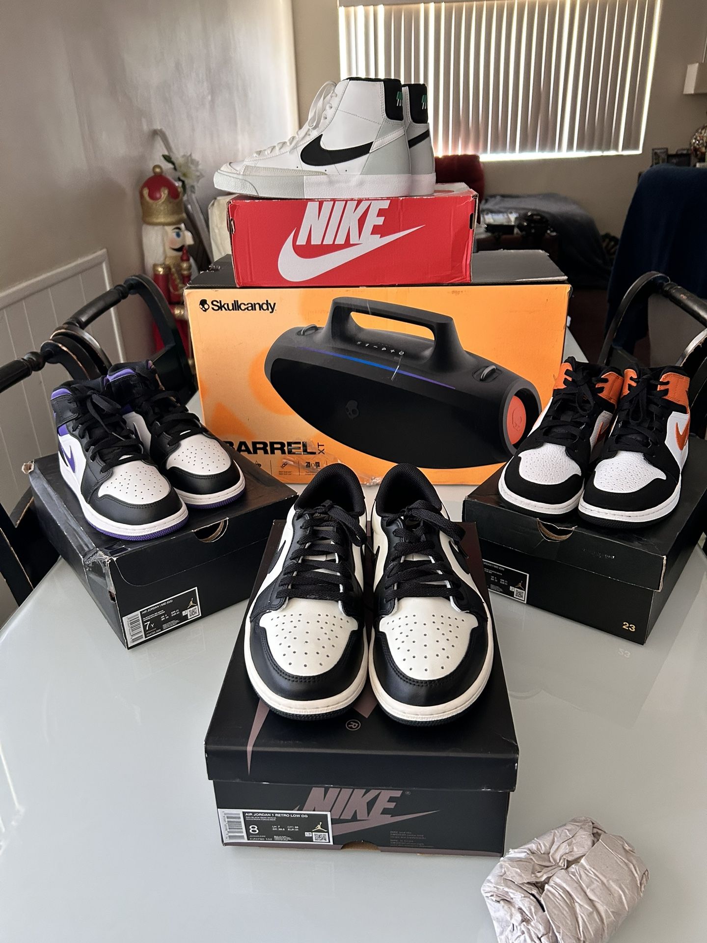 Nice bundle deal !! Nike Jordan mocha Size 8 Nike Jordan purple iris Size 7y Nike Jordan star fish white and orange Size 7y Skull candy barrel speaker with charger Need this gone sadly . Need the money . Need it gone asap !!!