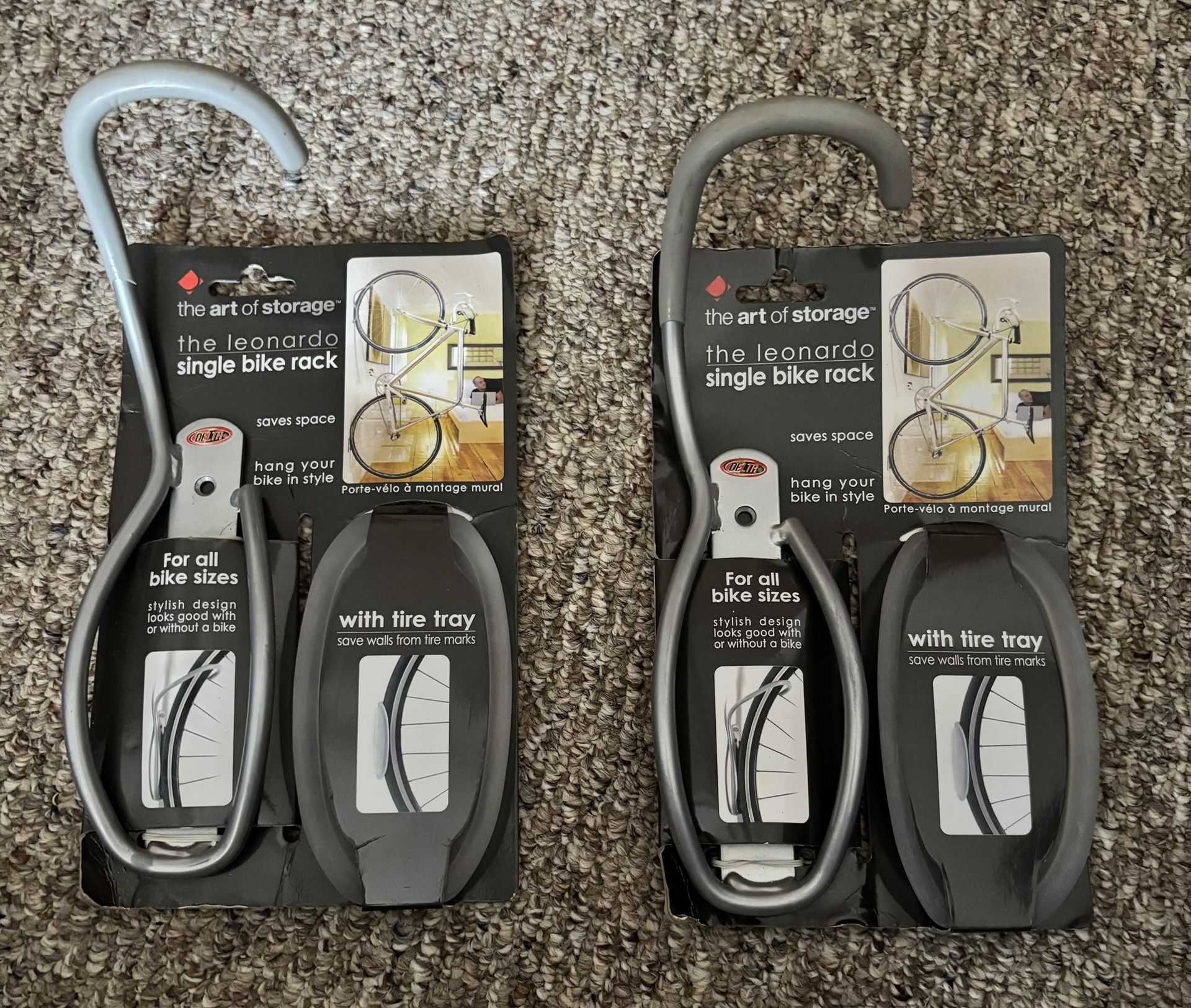 The Leonardo single bike racks For all bike sizes Convenient storage for any bike. Elegant space-saving design. Simple, easy installation (hardware included). Included tire tray saves walls from tire marks. Maximum load 40 lbs.