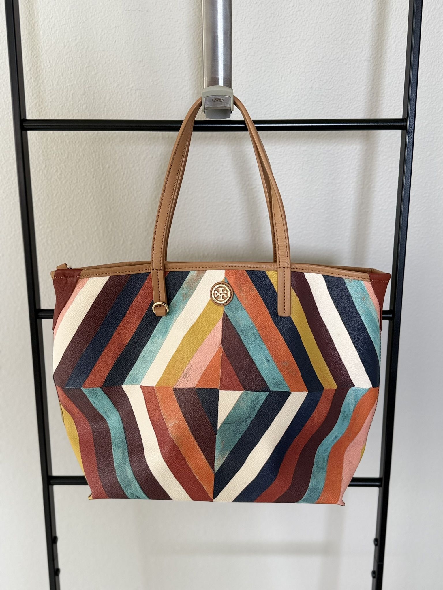 Tory Burch Multicolor Chevron Tote Bag-super cute and classic style. Statement piece! Vibrant chevron colors. Interior has a large zippered pocket in the middle large enough to fit a tablet. *Please note: it's not padded and the bottom of the pocket is not sewn to the bottom of the purse. Interior zippered pocket with another pocket for cell phone. Included a removable long strap. Only used the purse for about 1-2 years. There is a repair otherwise purse is in very good condition. There was a tear at the top that was repaired. With a piece of maroon leather. To balance it, a piece of maroon leather was placed on the other side of the purse. See pictures. The purse is: 15"w at the top 11"w on bottom 1"h 5.5"d (measured across the bottom) Located in Gig Harbor