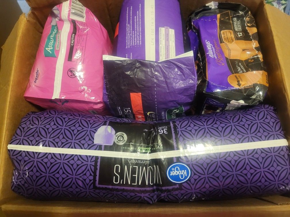 Box of Womens Disposable Underwear 73 pairs Total. Check the sizes. I tried to group similar kinds and sizes. This is how I received them. I'm selling them or willing to trade for the size my mother wears. If you have some you'd like to just donate, I do help others in need. Message me with what you have; incontinence supplies, creams and ointments, wipes, bed linens, bath towels and bed sore bandages is mostly what they use/need. No equipment or beds. Just like underwear! Comfortable and easy to use: Kroger 36 count Value Pack! Unopened. $8 Maximum Absorbency Specially Designed for Women With Cotton Enhanced™ Top Sheet Contour Core Fit Light Lavender Designer Color Omni-Odor Guard™ Plus Helps Prevent Odors S/M Fits 28"-40" Waist Size Dri-Lock Odor & Leak Protection Depend Night Defense 15 count Unopened $6 M 31-37" waist Pant size 8-16 Up to 12 hours protection. Absorbs 25x it's weight. Soft flexible fabric, Surefit waistband for comfortable fit. Blush/Light Pink color Soft-Stretched Waist Equate Assurance womens underwear Light Lavender color S/M 28-40" Waist 20 pack opened with 12 pairs remaining. $4 Designed and fitted for women. Soft breathable material, odor guard, maximum absorbancy. Always discreet Underwear Culottes S/M Maximum 24-40" waist /100-190 lbs Lightly scented Fabric feel 12 count pack with 10 remaining. $9 They are taped shut but I believe they look like the picture on the package. Blush colored with black lace design at the top. Single Use, Disposable...and discreet. $25 for all. Smoke Free Home You pick-up in S. Federal Way. Cash Only. Check out my other listing for other incontinence items.