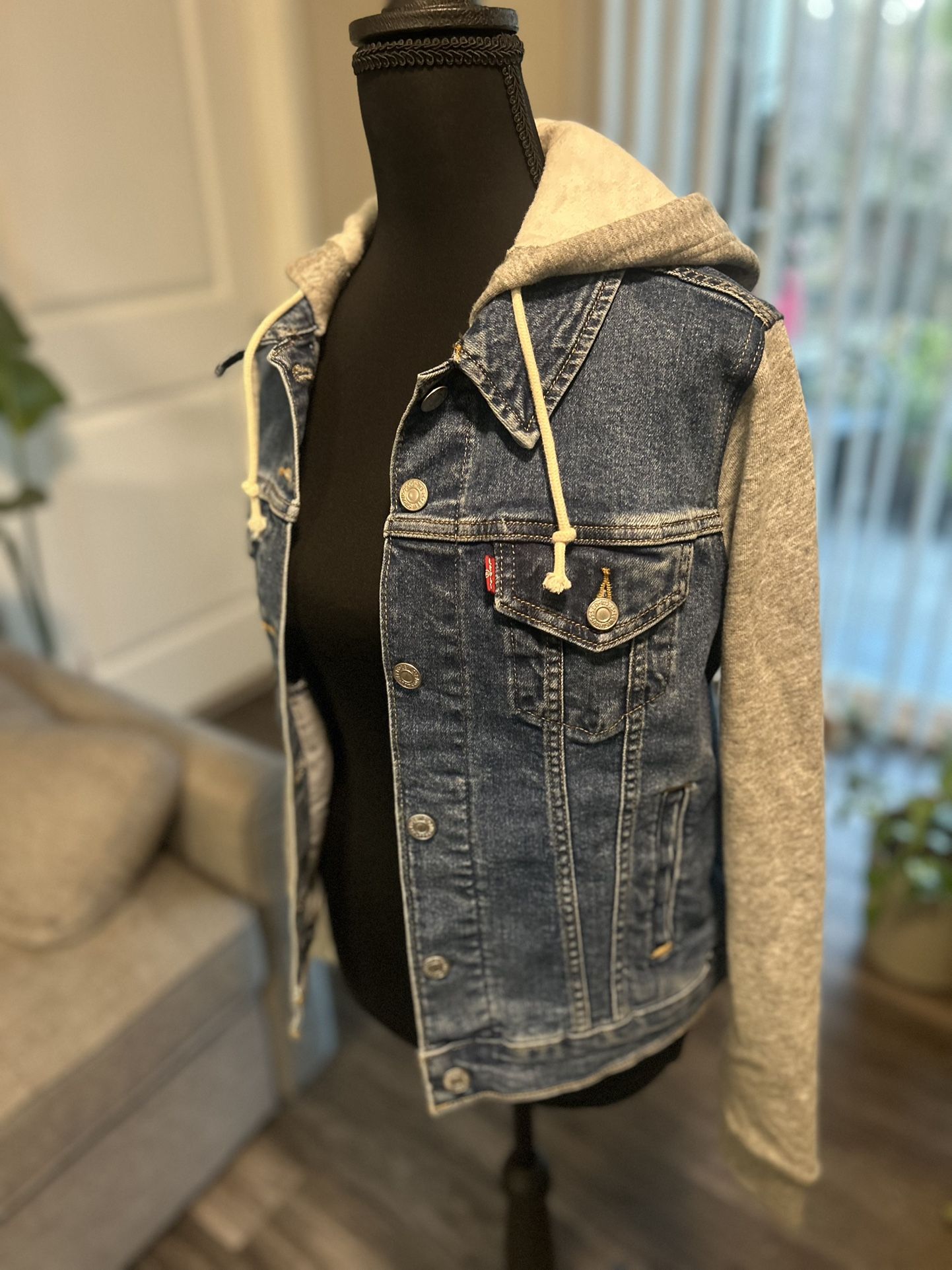 Woman’s Levi’s blue Jean jacket size medium with grey hoodie and sleeves attached