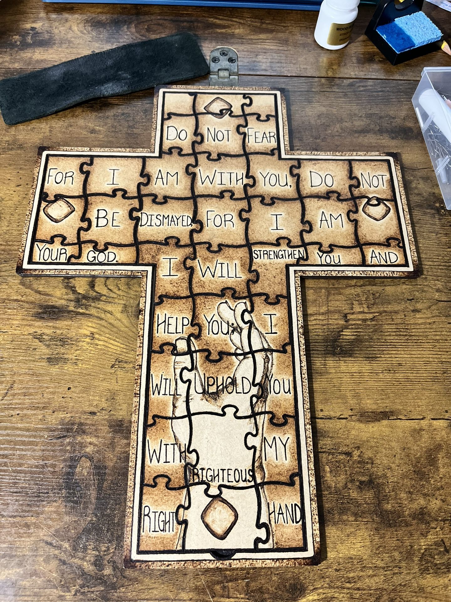 This is a pressed wood jigsaw puzzle with hand wood burned design by me! This is a beautiful gift idea or for yourself! It has about 34 pieces and it’s 13 inches wide and 16inches long and about a quarter of an inch thick!